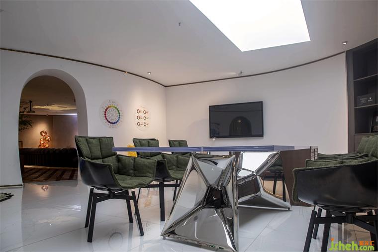 最后呈現(xiàn)的選板展示區(qū)域為客戶提供自由探索的可能,裝修設(shè)計創(chuàng)建了選板桌區(qū)域,并輔以木制陳列柜,展示豐富的高品質(zhì)原料。為呈現(xiàn)與會談空間不一樣的感覺,設(shè)計師在軟裝陳列上引入夸張變化的飾物,以及充滿視覺張力的藝術(shù)畫作,打造啟迪靈感的創(chuàng)意之所。