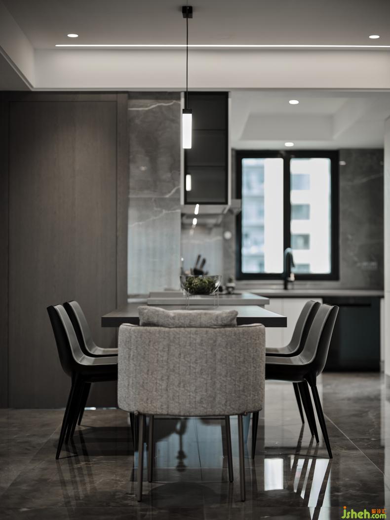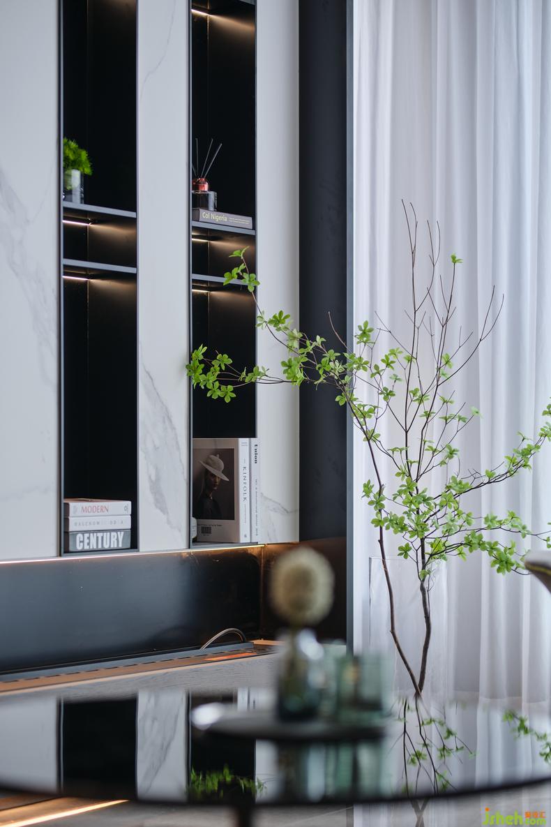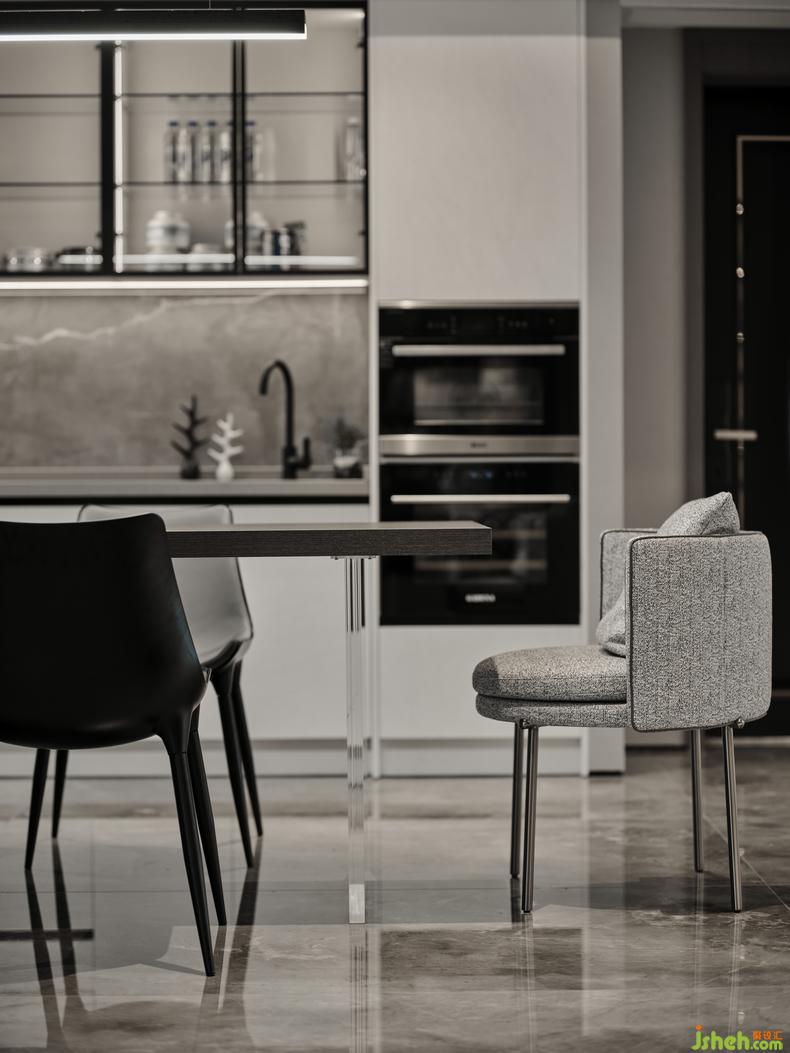 深棕色立柜從地面抵到頂面,連接著客廳、餐廚兩大功能空間,在實(shí)現(xiàn)完美收納的同時(shí)也消解了白墻的寡淡。柜體上藝術(shù)裝置的細(xì)節(jié)點(diǎn)綴亮點(diǎn)滿滿,真正經(jīng)過(guò)思考的藝術(shù)品選擇、裝點(diǎn)技巧,都是于無(wú)聲處聽(tīng)驚雷的狀態(tài)。