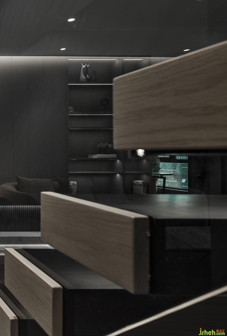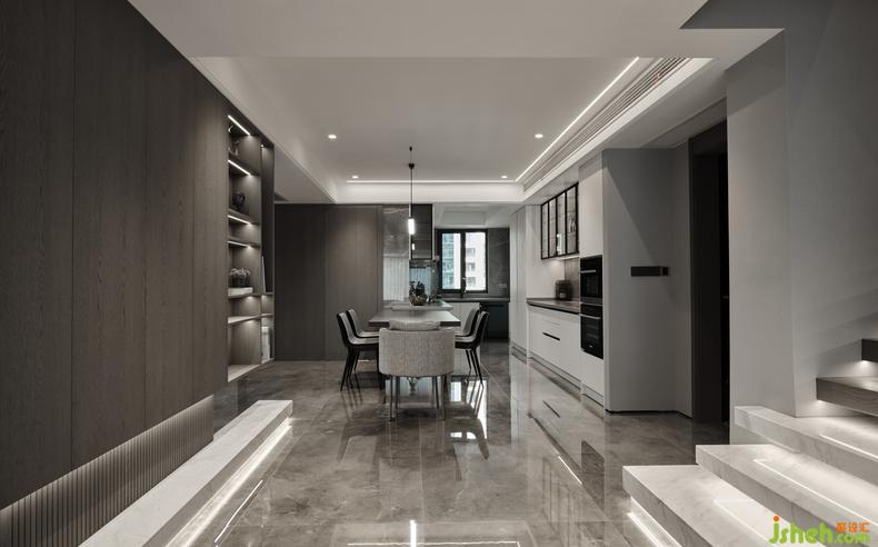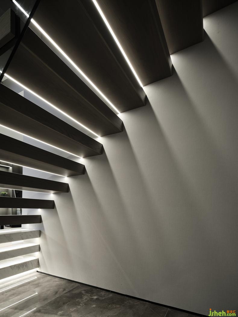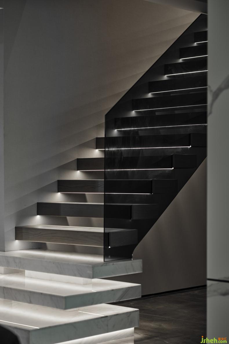 在本案中,樓梯的線條感設(shè)計(jì)讓人贊嘆,大理石面一級(jí)一級(jí)拾階而上,長(zhǎng)條的燈帶制造了晶瑩剔透的效果,如同水紋漾開(kāi)的粼粼波光,美好得令人心醉,成為室內(nèi)的一處絕佳景觀。