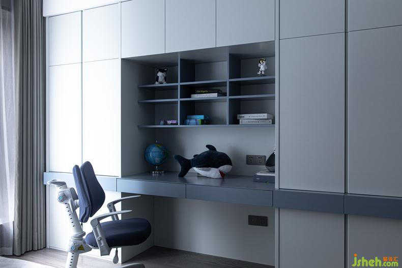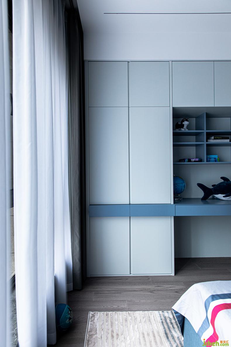 在不破壞沉靜底色的情況下,次臥的兒童房選擇了海藍(lán)色。設(shè)計(jì)師特別控制了藍(lán)色的飽和度與明度,點(diǎn)綴的尺寸也把握得恰到好處,既制造了令人驚喜的效果,契合孩童的天性,又不致過(guò)于脫離全屋的風(fēng)格屬性,空間與空間依然和諧共生。