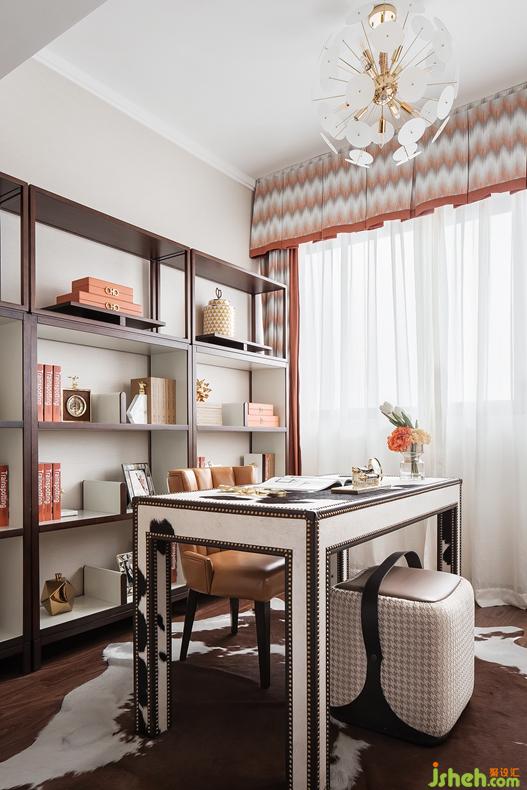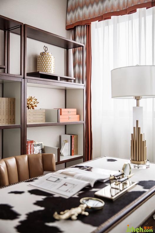書房在細節(jié)處理上,書桌毛皮的大量運用,高聳的書架,通過這些細微的表達傳遞出主人公的品味特質(zhì),他必定是享受學(xué)習(xí),有自己的愛好與追求。胡桃木色與奶白色調(diào)木飾面搭配的書架沉穩(wěn)內(nèi)斂,點綴些橙色與咖色,在靜謐中藏匿著奔騰而有活力的內(nèi)心。一盞蘑菇燈,不僅是功能上的滿足,也是業(yè)主對品質(zhì)生活的追求,結(jié)合經(jīng)典款家具為整個家增添了品質(zhì)感。