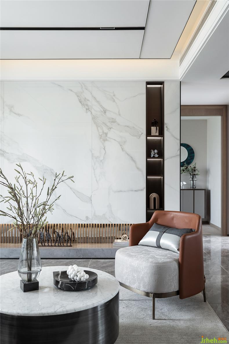 各色擺件,皆有考究。金屬燈桿、水晶球、玻璃瓶,透過光影交織,樣板房設(shè)計(jì)產(chǎn)生似水如鏡一樣的清澈柔亮。細(xì)細(xì)品酌,瓷質(zhì)的白色葡萄珠在乳白的大理石映襯下,如玉溫潤(rùn)。