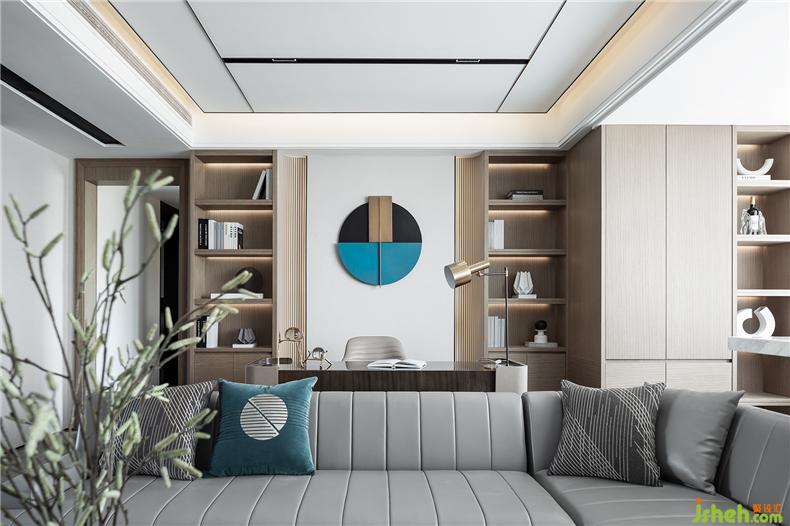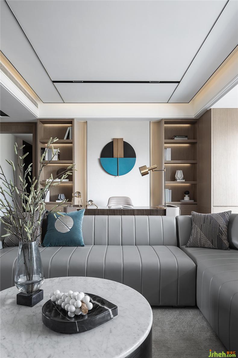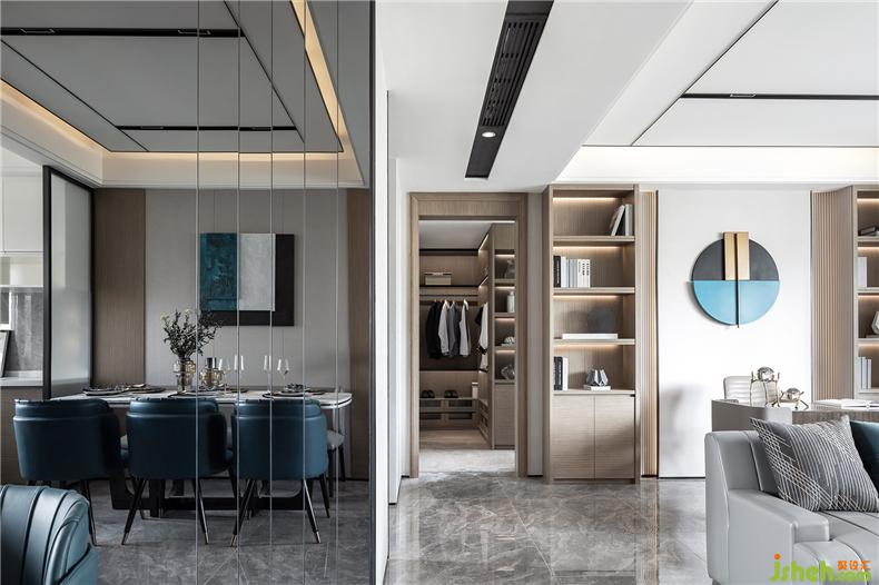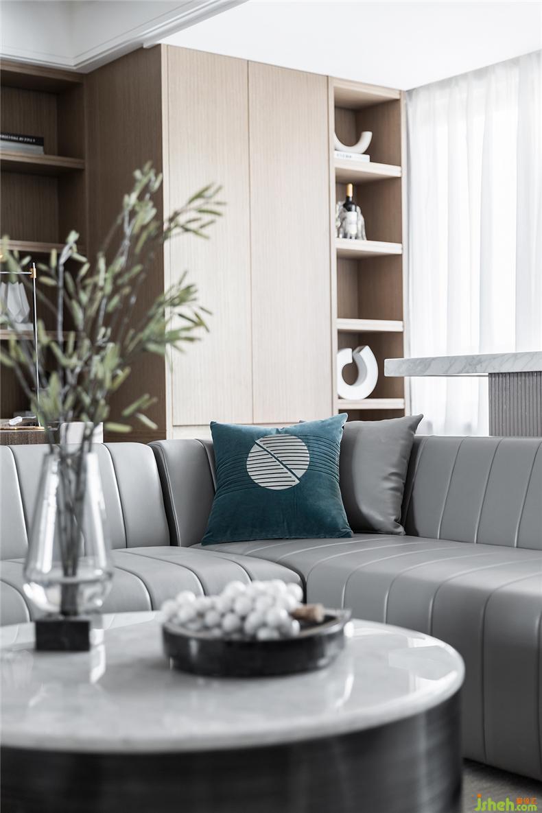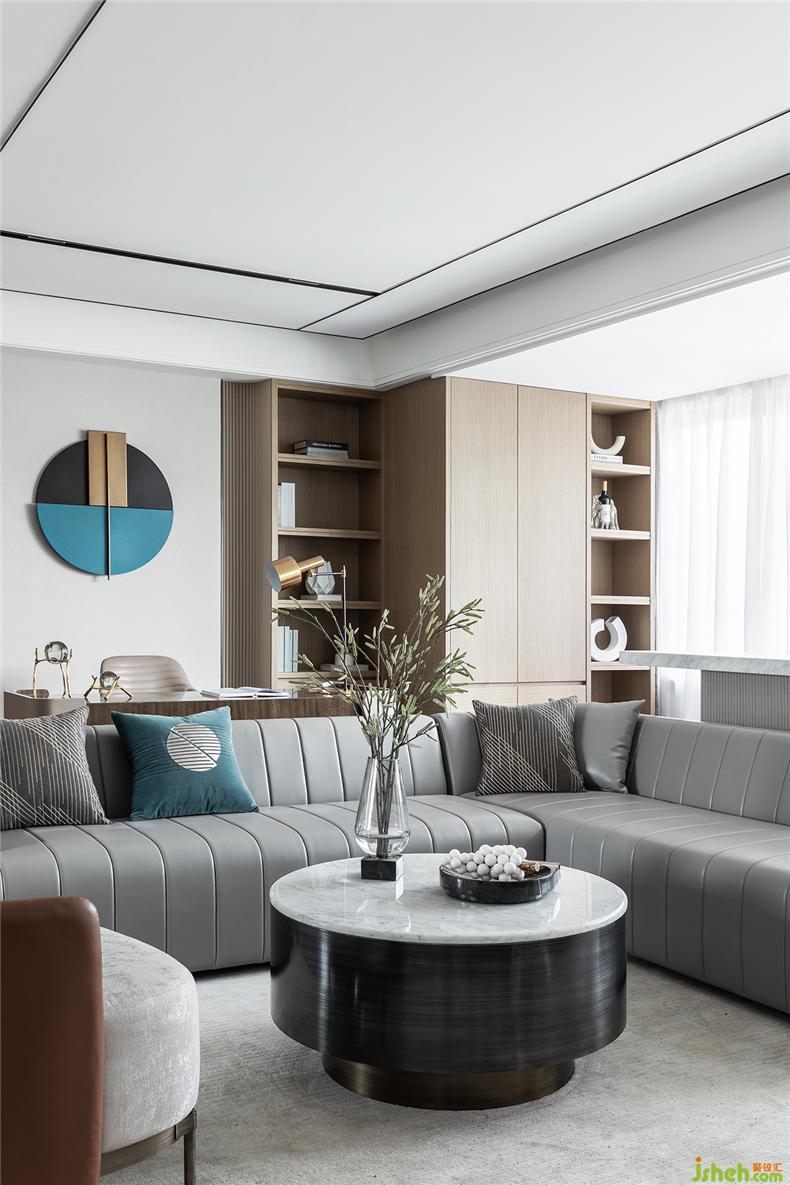 而為增加空間的層次性,設(shè)計(jì)師還利用墻體鏡面與沙發(fā)的載體,在同一視線上形成呼應(yīng),而材質(zhì)上剛與柔的不同屬性,在較量中相互凸顯,無分伯仲,且缺一不可。