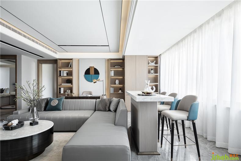 作為簡(jiǎn)約現(xiàn)代風(fēng)格,空間線條簡(jiǎn)明利落,棱角分明,契合純凈的色彩,樣板房設(shè)計(jì)凸顯著都市白領(lǐng)向往的前衛(wèi)與時(shí)尚。吧臺(tái)一改往常,設(shè)計(jì)師特意將其落于窗邊,既延展了室內(nèi)視野,塑造更好地視覺享受。