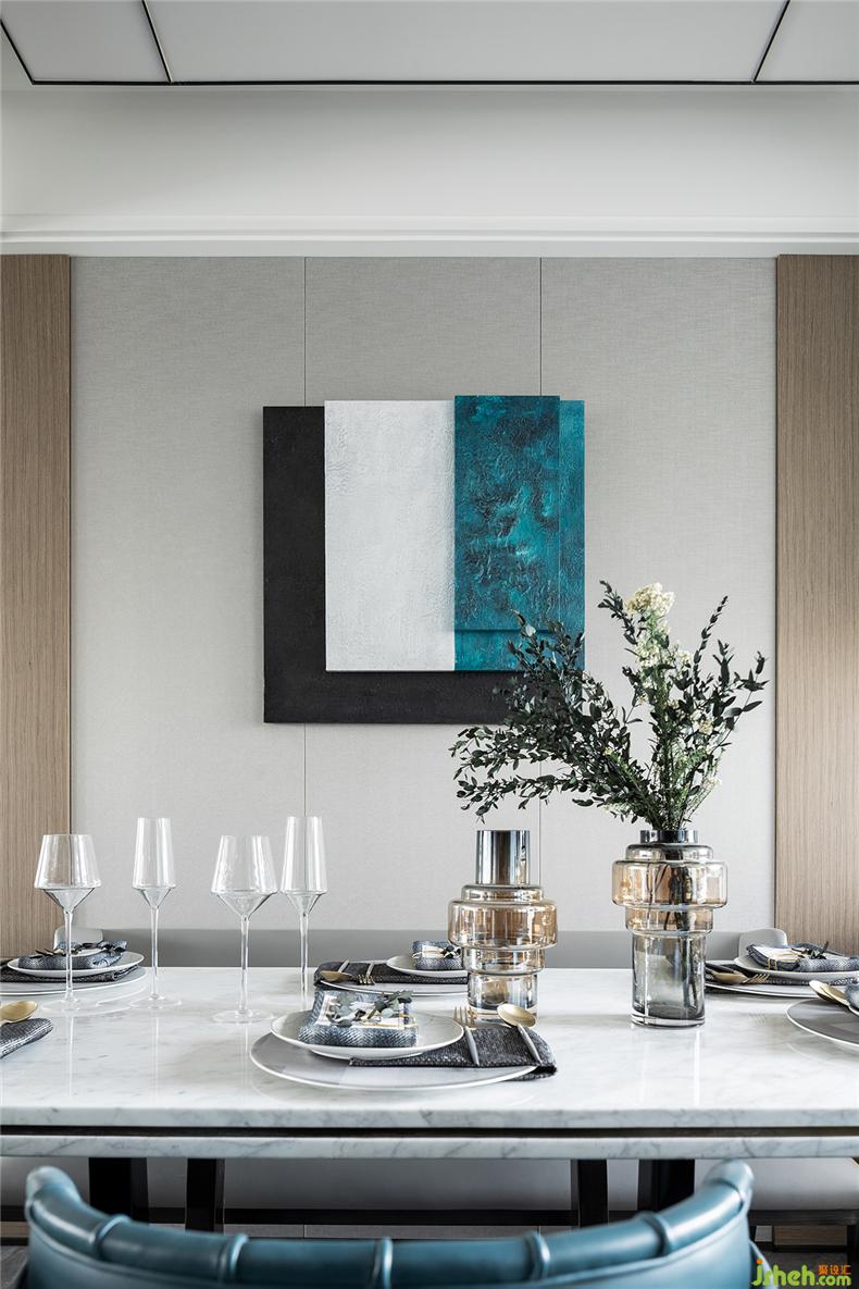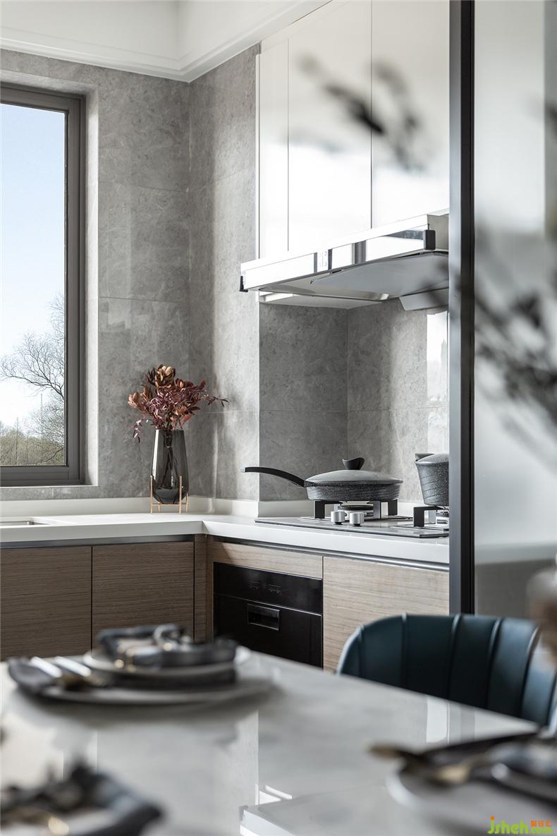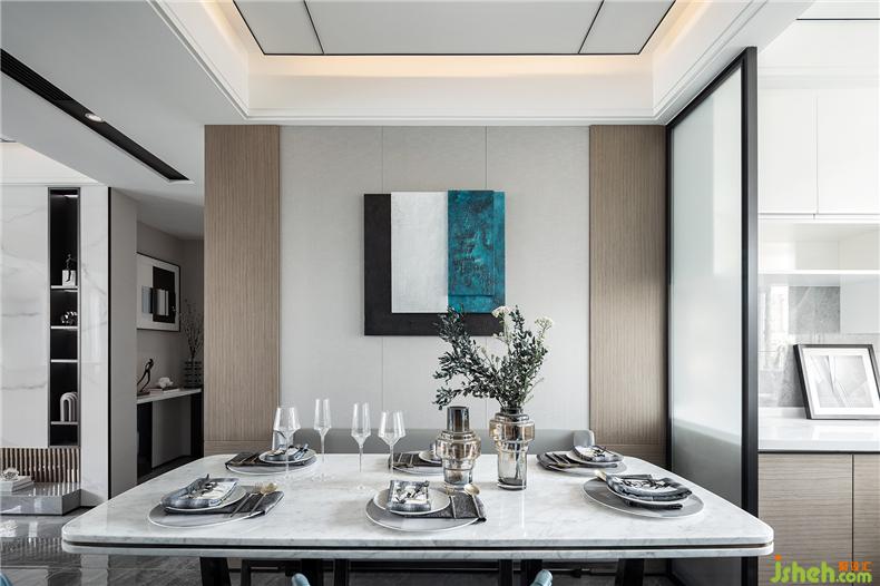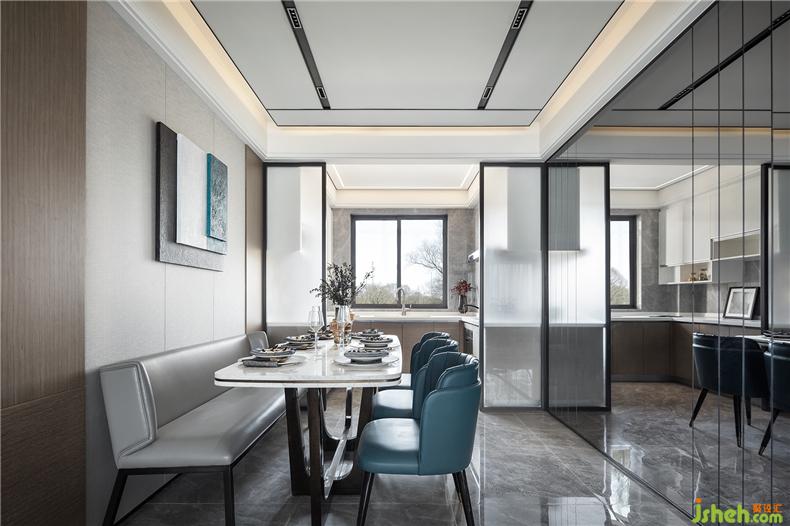 廚房與餐廳不設(shè)推門,解決了區(qū)域原本布局的狹窄弊端,同時(shí)利用鏡面反射,樣板房設(shè)計(jì)增強(qiáng)空間的開闊性,且一虛一實(shí),再造呼應(yīng)。