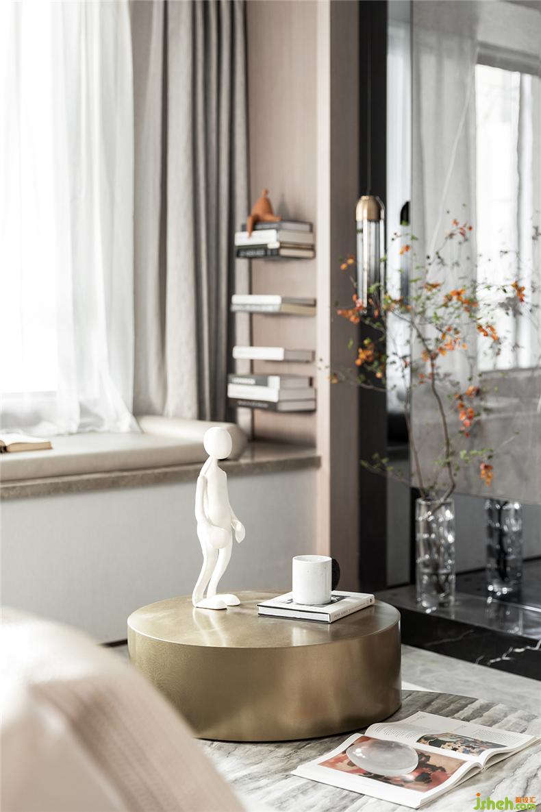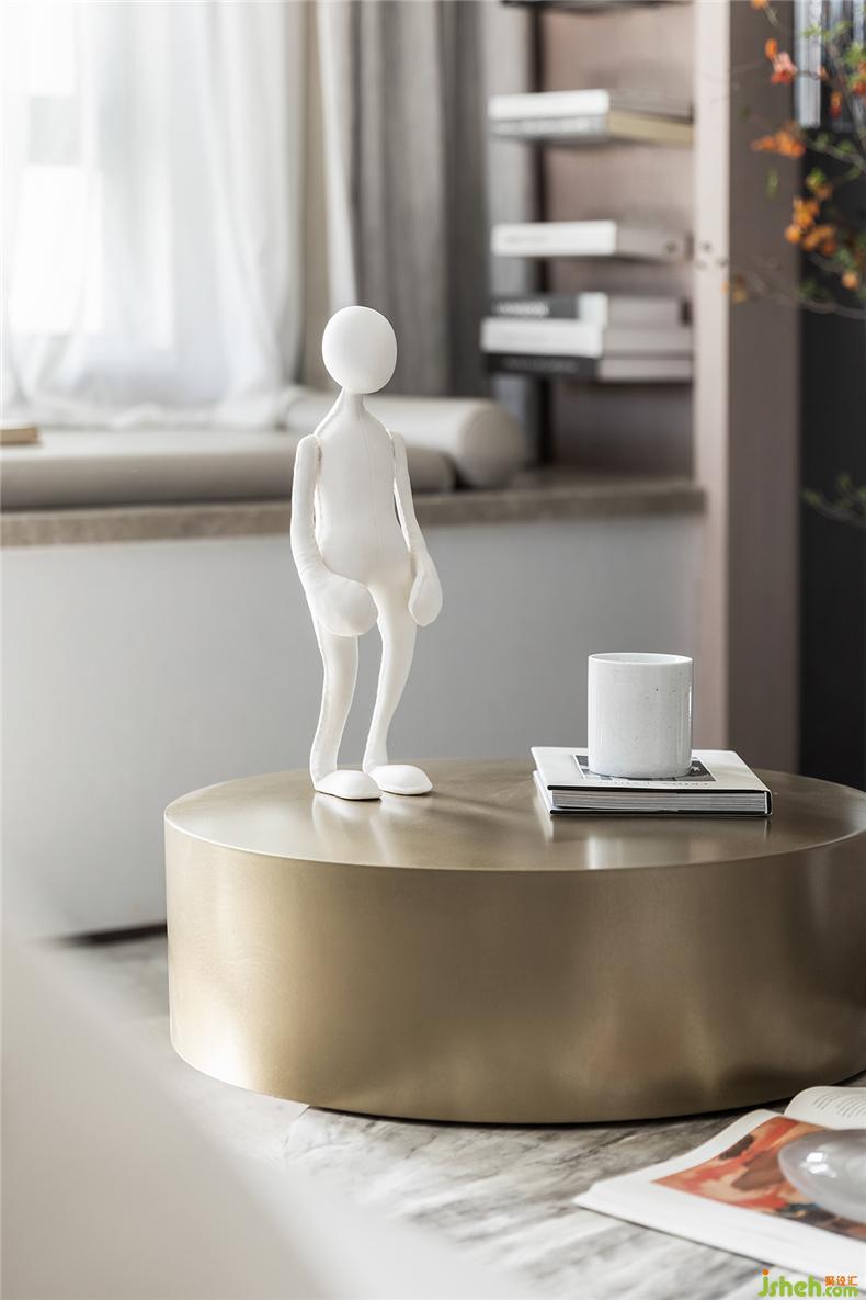 書本、畫冊(cè),甚至愛不釋手的白瓷水杯、人形模具,在金色的臺(tái)面上更顯精致,樣板房設(shè)計(jì)看似隨性而松散的配置,給足了空間靈性和呼吸。