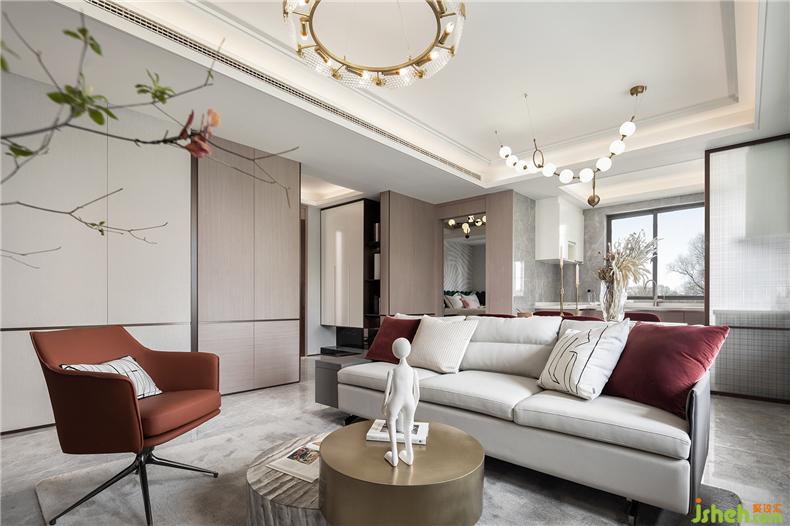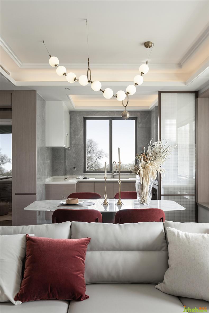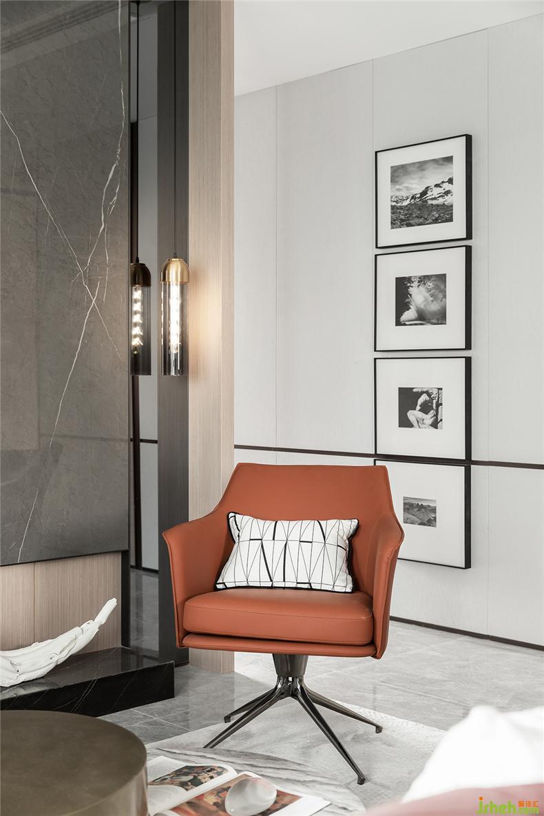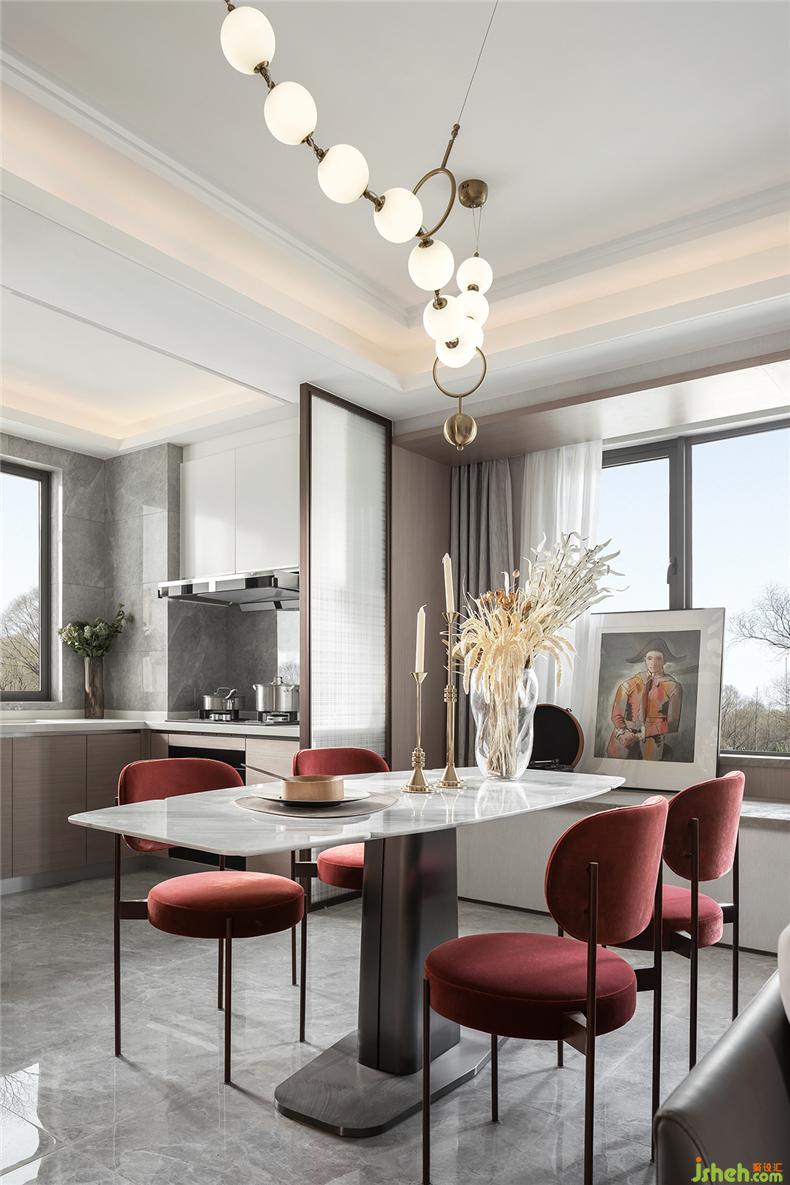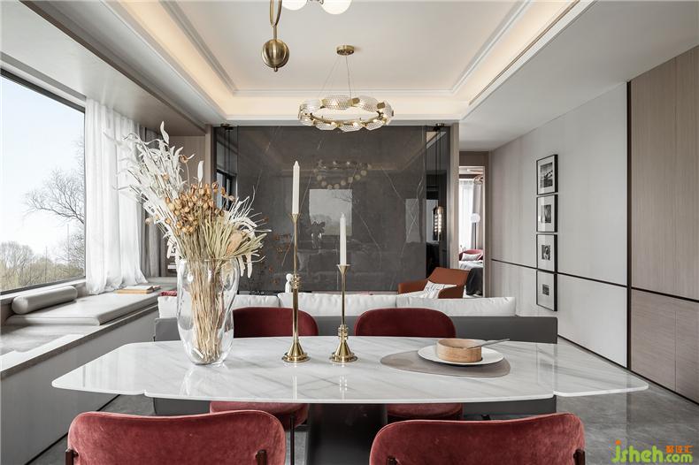 “以張為發(fā),以弛為蓄”,簡潔中不失強(qiáng)烈的裝飾,樣板房設(shè)計(jì)再強(qiáng)調(diào)材料的高貴質(zhì)感與光澤,明暗互襯,對(duì)比鮮明。大面積的灰色大理石與深紅的布藝碰撞,濃烈而深沉,莊嚴(yán)而優(yōu)雅,竟不自覺地讓焦點(diǎn)停留。