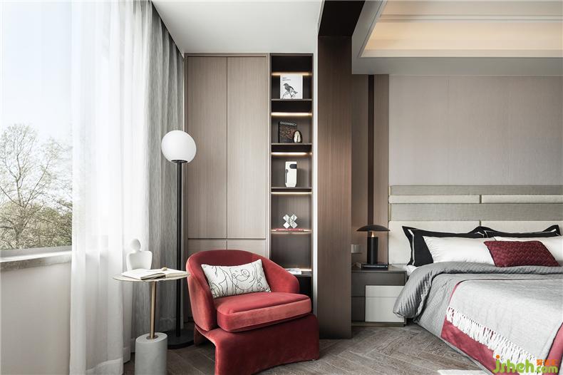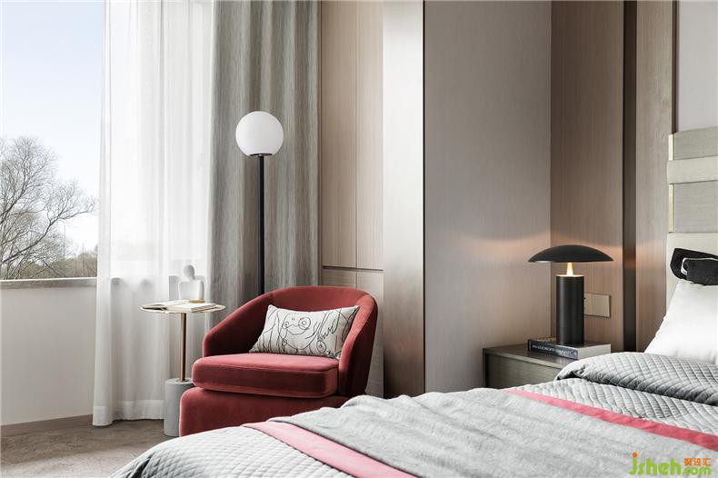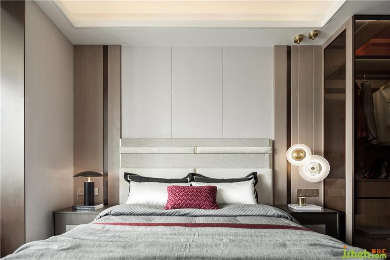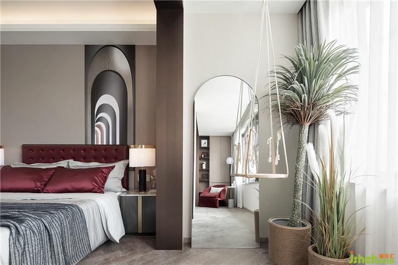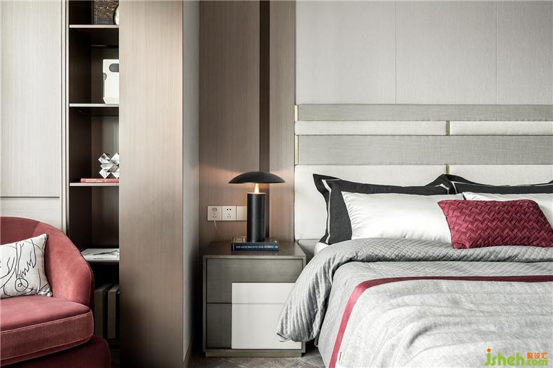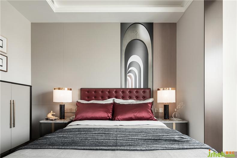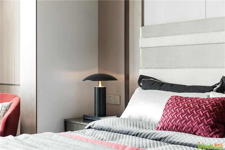 臥室的設(shè)計(jì)延續(xù)了客廳的用意,從墻體到軟裝,淡色調(diào)為主,樣板房設(shè)計(jì)不同灰度的色塊組合拼接,搭配酒紅色的布藝,格外醒目,精細(xì)車線工藝以及絲滑的材質(zhì)盡顯雍容大氣。