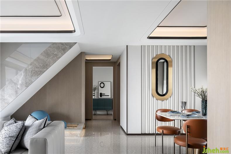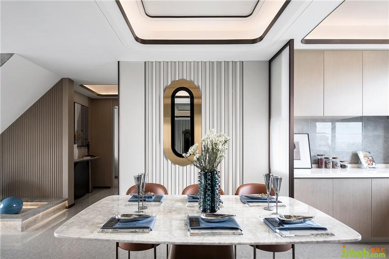 餐廳的設(shè)計則將藝術(shù)理念與精致生活描摹得淋漓盡致,樣板房設(shè)計每一處細節(jié)都彰顯著高雅格調(diào)。黑金色的平面掛鏡,一種“平途”與“崎嶇”、“平滑”與“褶皺”視覺感受油然而生,貴氣十足,精巧中透著一種靜美之風(fēng)。