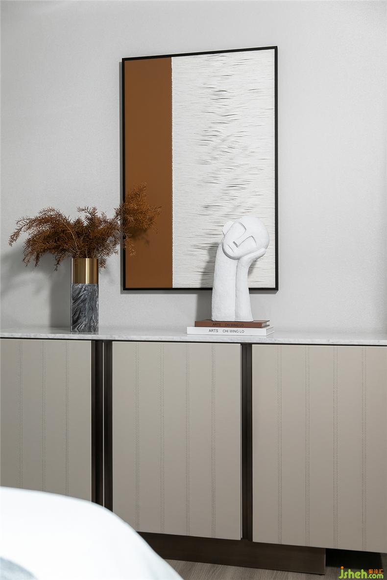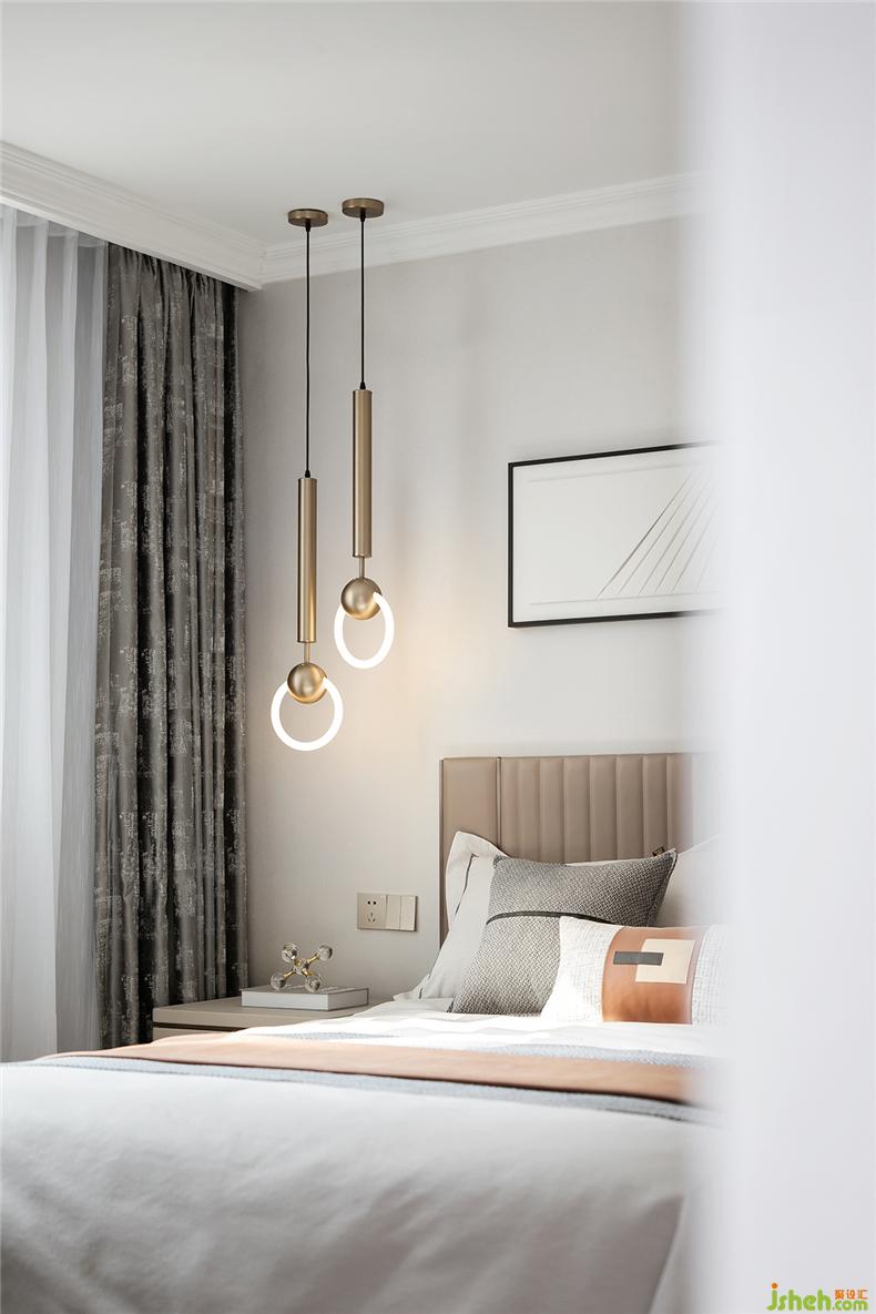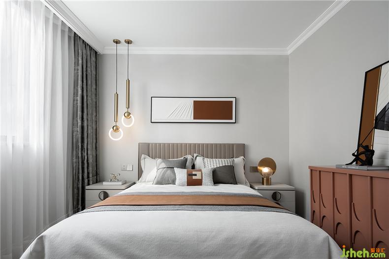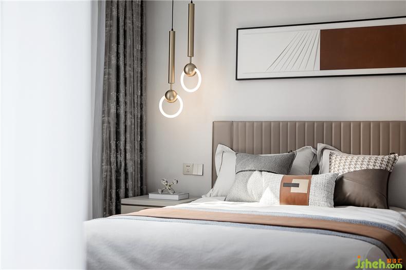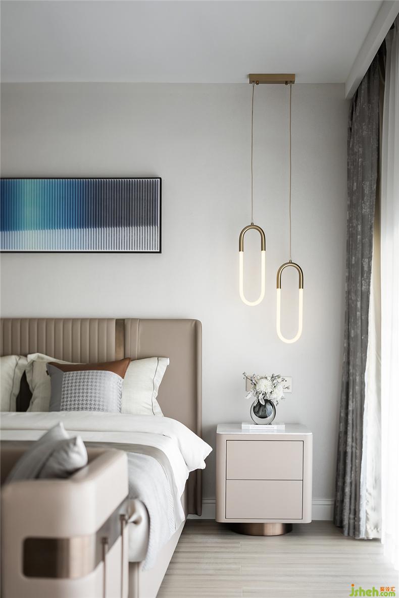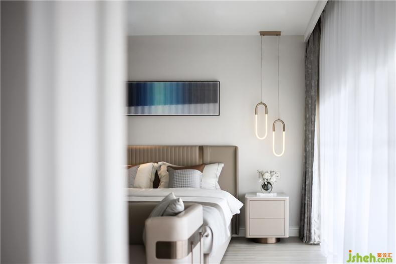 主臥靜謐有序,光影在彼此間形成隱隱的虛實關系,簡約家居和燈具型體,樣板房設計構造出靜默安然的視覺感受,床尾不可或缺的獨立沙發(fā)和茶幾,提升居室的另一種休閑感。