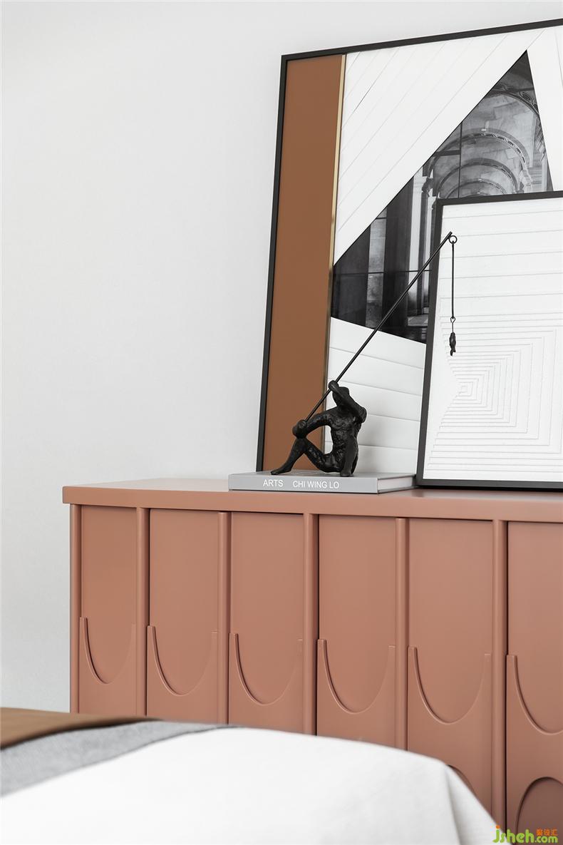 干凈的灰白色營造出恬淡靜雅的氛圍,藝術在其中表現出素樸之道,現代的線條勾勒出藝術情調,樣板房設計空間中加入了橘色元素,讓空間多了份溫暖和舒適。