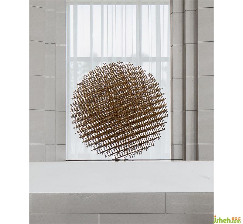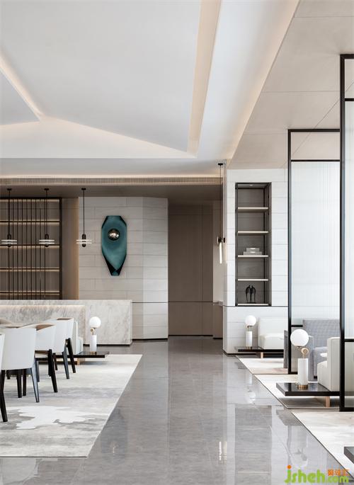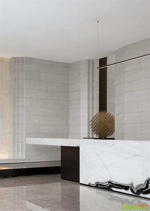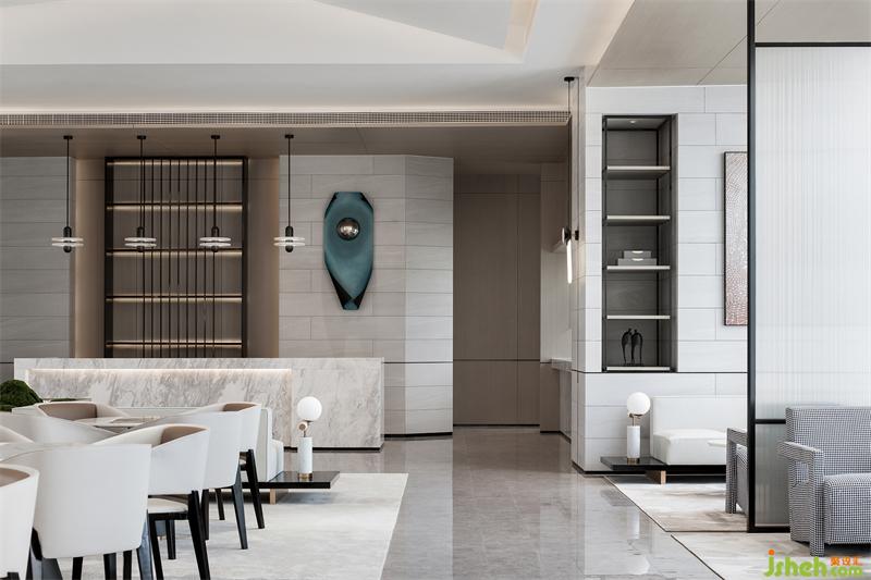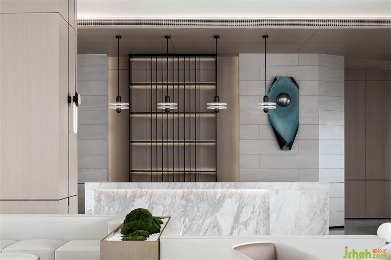 純粹的空間,泛著淡淡的雅致,石材以干凈利落的切角分面,透出現(xiàn)代的塊面設(shè)計手法。墨綠色的金屬掛飾,個性而時尚,彰顯空間的高級藝術(shù)感。