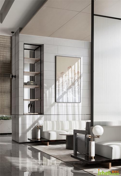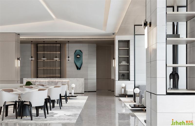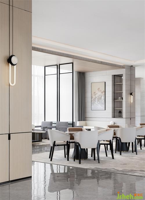 洽談區(qū)洗練的建筑語(yǔ)言,形成豁然開(kāi)朗的空間序列。富有張力的天花、秩序有落的金屬玻璃屏風(fēng),為疏落的空間增添趣味性和節(jié)奏感。