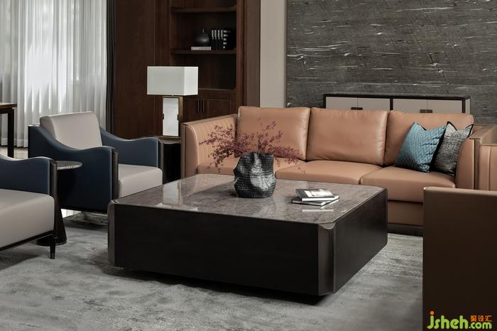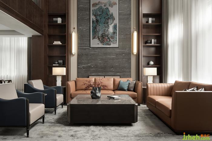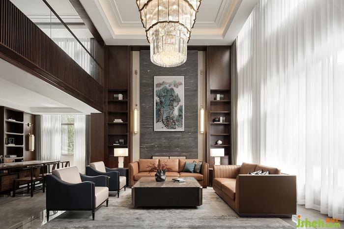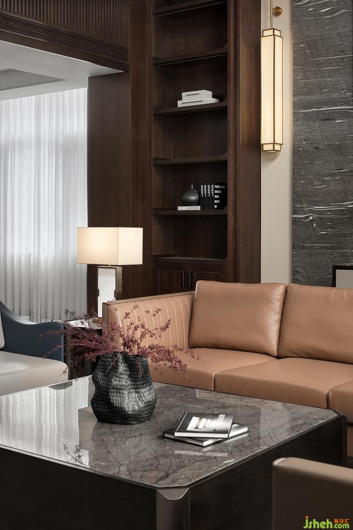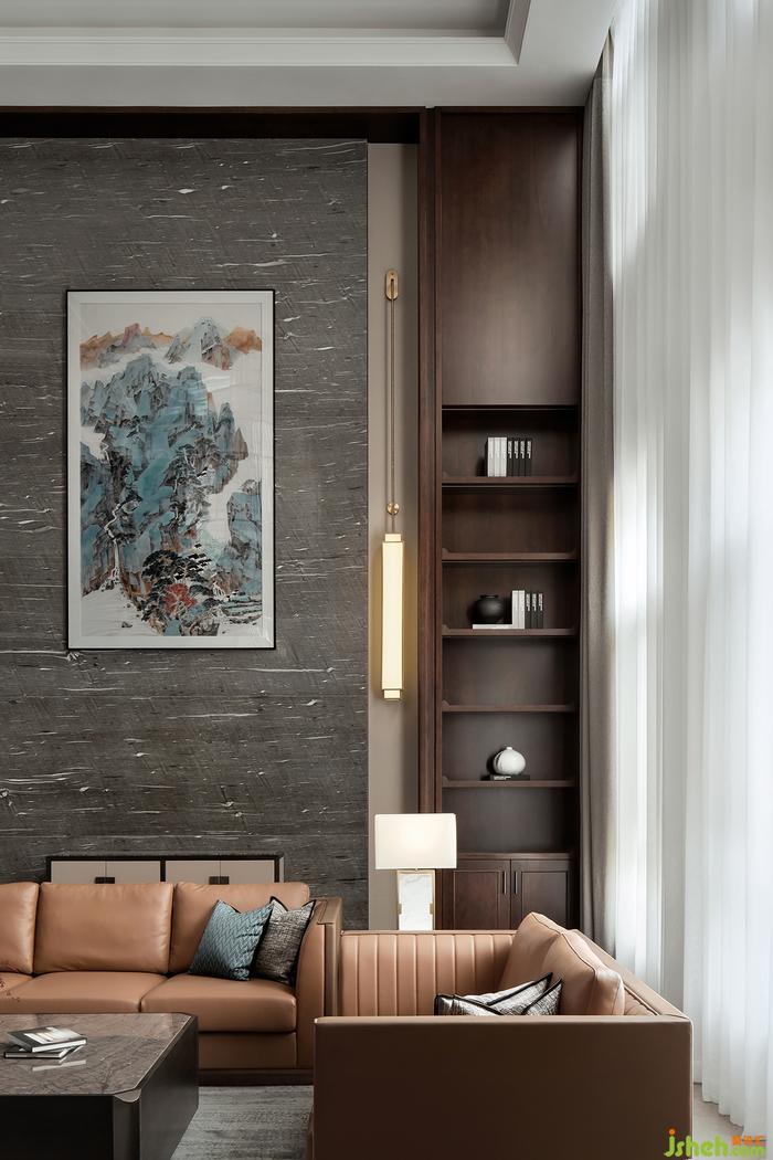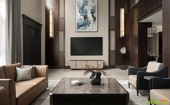 挑高的一層會客廳,大面積運(yùn)用深色的木飾面,讓整個空間透著一股淡淡的木香。天然大理石和兩側(cè)裝飾柜相得益彰,裝飾壁燈點(diǎn)綴其中,營造出一派書香安靜的大宅氛圍。