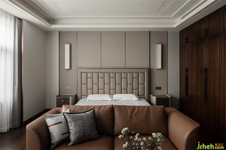 臥室延續(xù)整體空間的風格,灰色與米色的中性背景色鋪陳空間層次,以床為中心延伸成組合套系,駝色沙發(fā)、淺白臺燈、暖調(diào)實木,賦予空間靜謐安寧的理性基調(diào)。