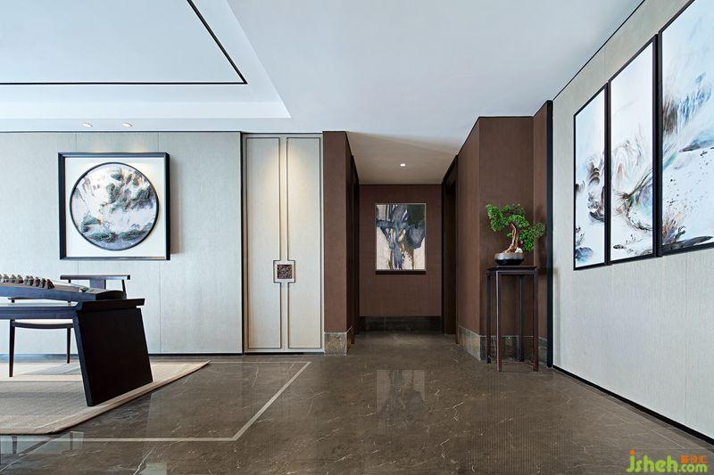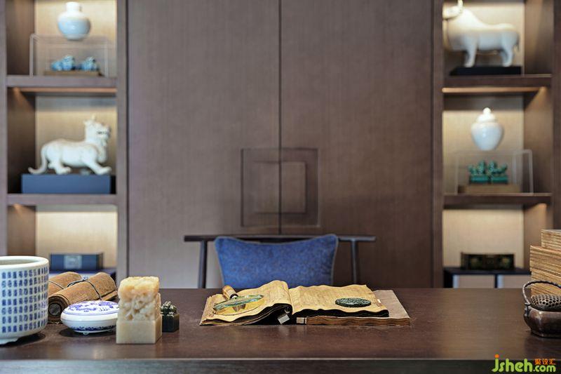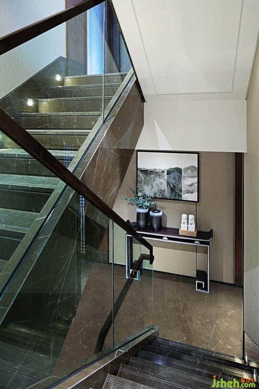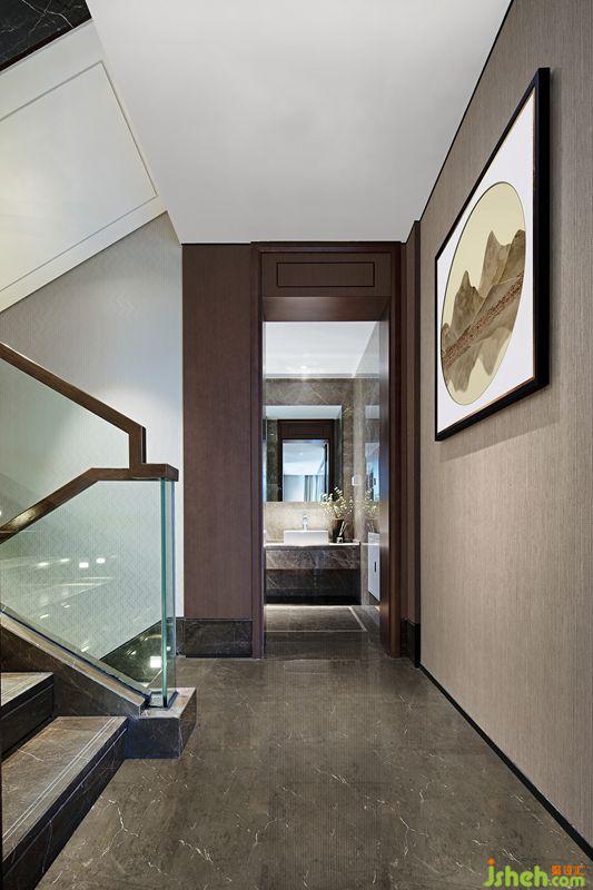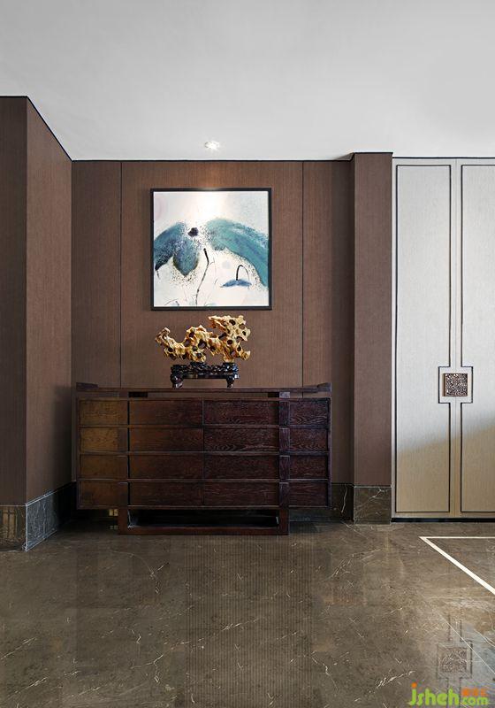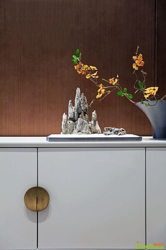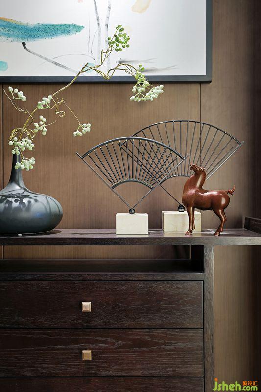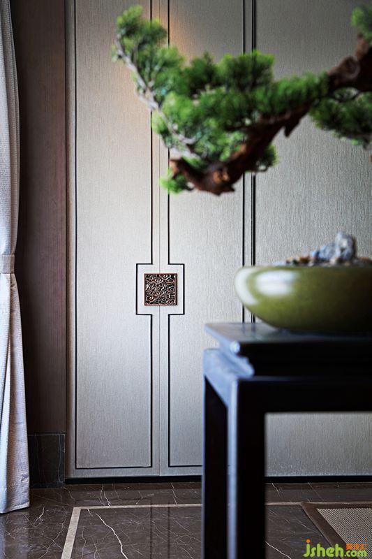 別墅裝飾中式的文化是內(nèi)斂低調(diào)的,設(shè)計(jì)師將“中”字很巧妙的植入到柜門的拉手及墻面裝飾上,營造一種低調(diào)奢華感。