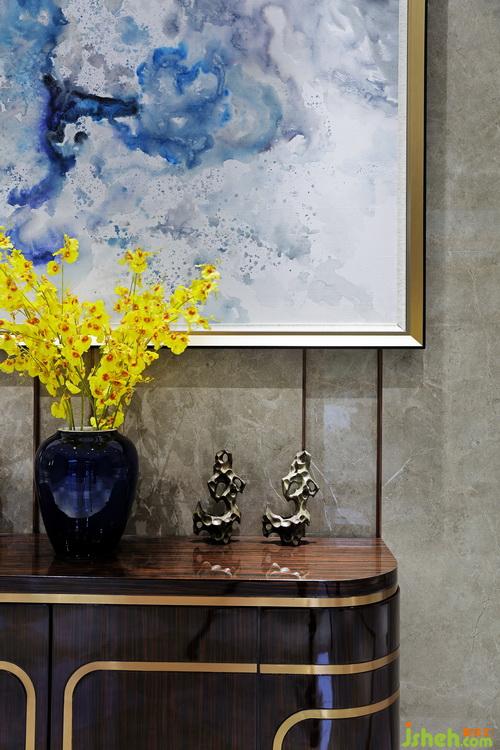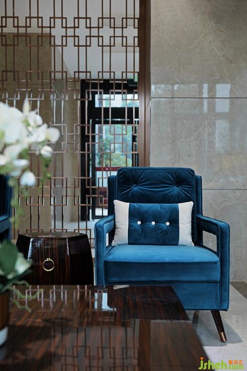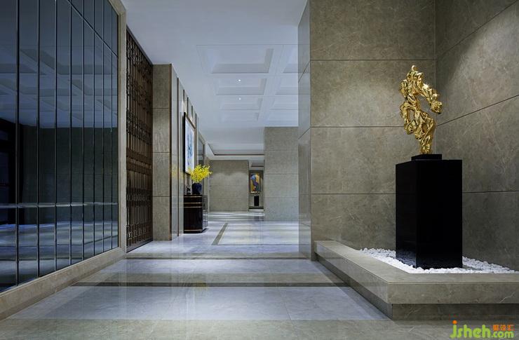 屏風(fēng)延伸了灰鏡造型,使得通往電梯廳過(guò)道,可以通過(guò)灰鏡造型看到碎石雕塑風(fēng)景,鏡面造型將燈光與自然光相互滲透反射在碎石上的落地雕塑,擴(kuò)大了通道視覺(jué)感,并感受到在此之外有更多影象。