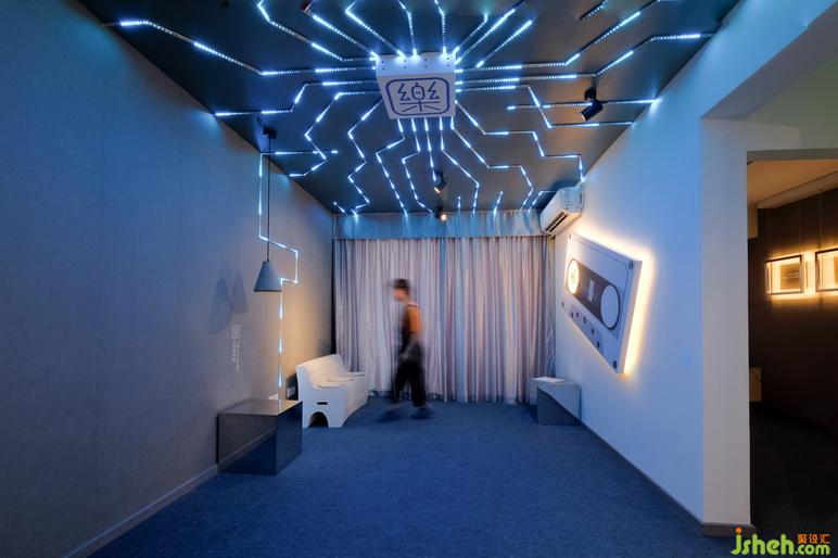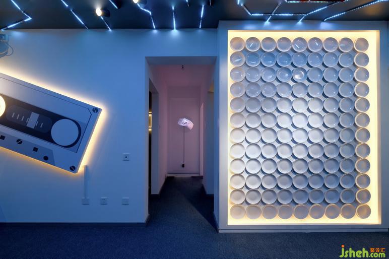 80年代磁帶、陣列式排布的瓷盤,角落處可自由拉伸的紙椅。材質(zhì)與情境完美融合,給整個(gè)空間帶來更多的互動(dòng)性與趣味!會(huì)所設(shè)計(jì)
