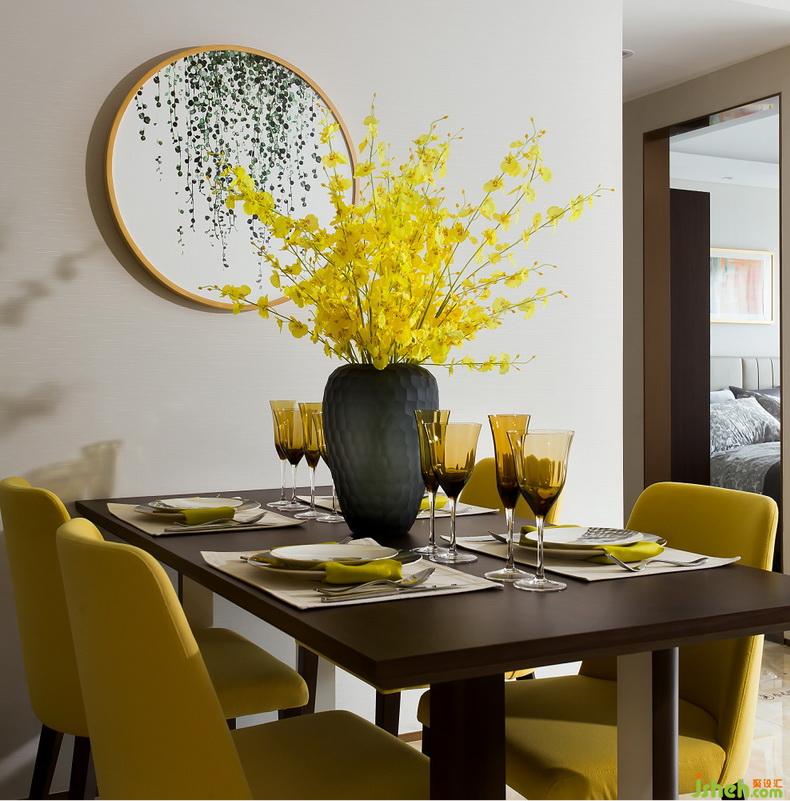 客廳部采用了米黃色作為主要基調輔以銀杏黃穿插其中使得整個空間色彩更加豐富,溫馨且舒適,每天伴隨著柔和的陽光注入進來,飽滿而又富有生命力,聽著清新純樸的木吉他旋律,不時還伴有讓人神迷的特設花香,讓人放下一切包袱,沉醉于此。材質上我們主以自然物料為主,棉麻、實木、玻璃及鐵藝,并適當的調和各種材質在空間所占有的比例,讓其在一種和諧統一的空間氛圍中形成對話。室內設計師