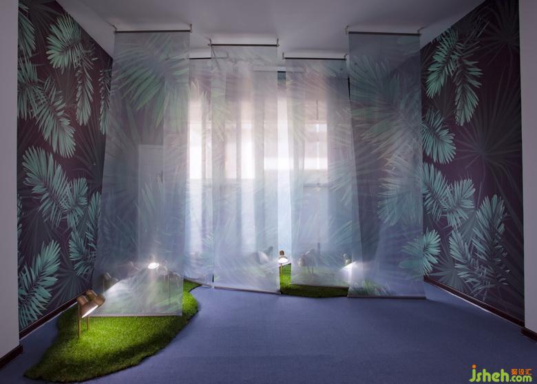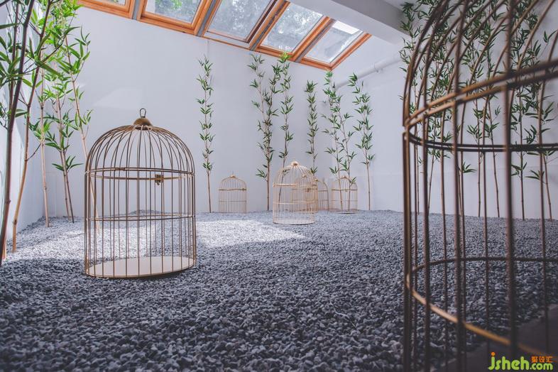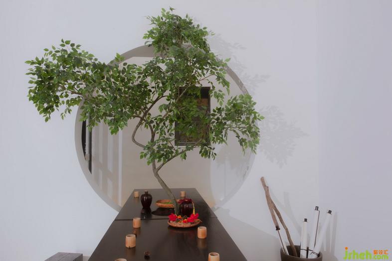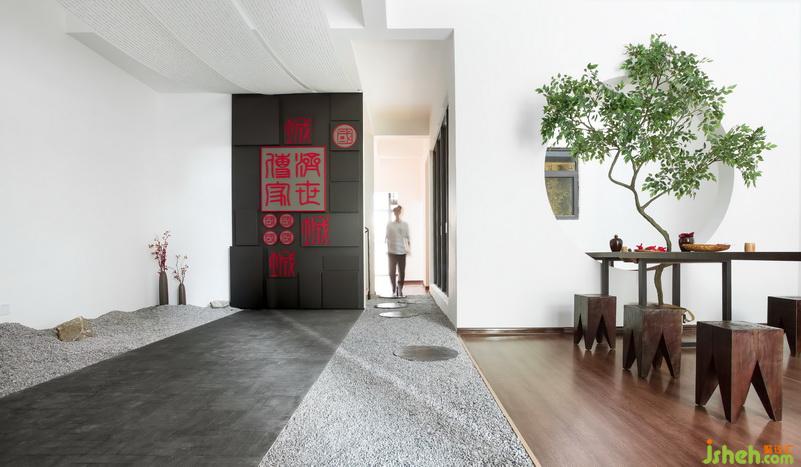 推門而入,家書簾首置眼底,枯山水造景置于兩側(cè),家書簾的端頭是傳統(tǒng)方形印章雕塑。采用中式借景的手法連貫中庭、客廳。品茶、論道、觀景,忘卻繁雜,僅存豁達(dá)。