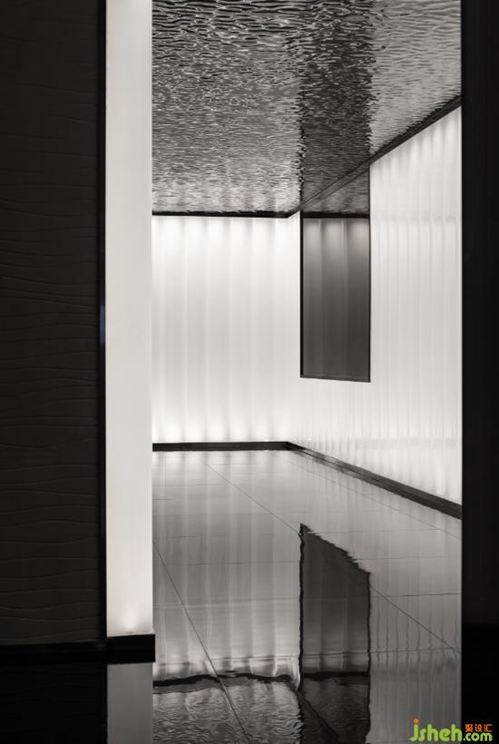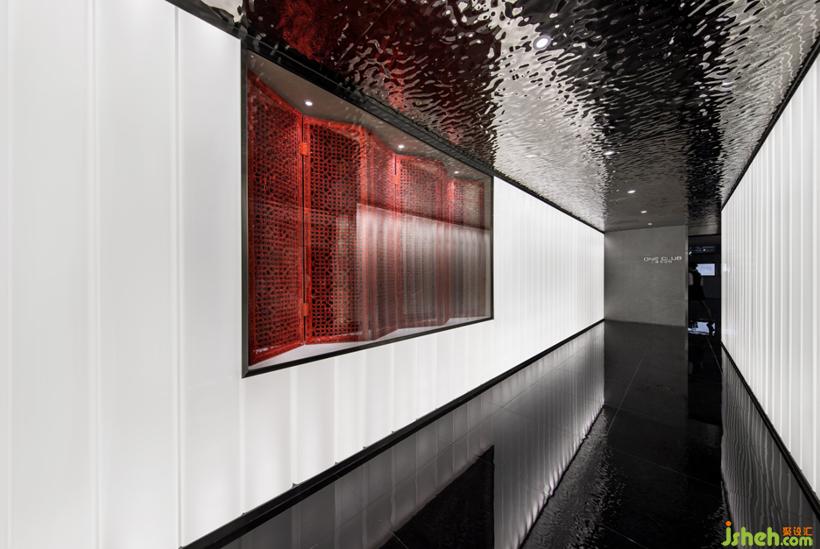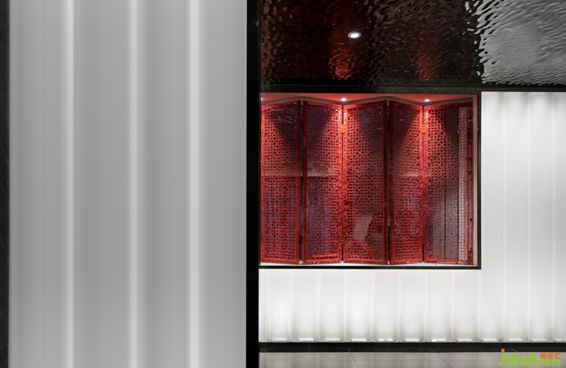 U型玻璃是一款新型的可發(fā)光材料,用于構(gòu)建整個入口處的光廊;黑金沙地磚深邃神秘,鋪設(shè)整個地面作為托底;金屬波紋板天花,詮釋了深圳前海特殊片區(qū)的的海洋靈動,同時彌補了層高不足的壓迫感。