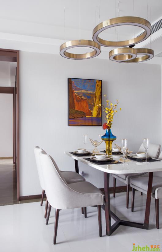 餐廳是客廳部分的延伸,弧線形倒角設(shè)計(jì)讓就餐氛圍變得更為融洽,掛畫與花藝相呼應(yīng),讓整個(gè)就餐氛圍變得活躍。