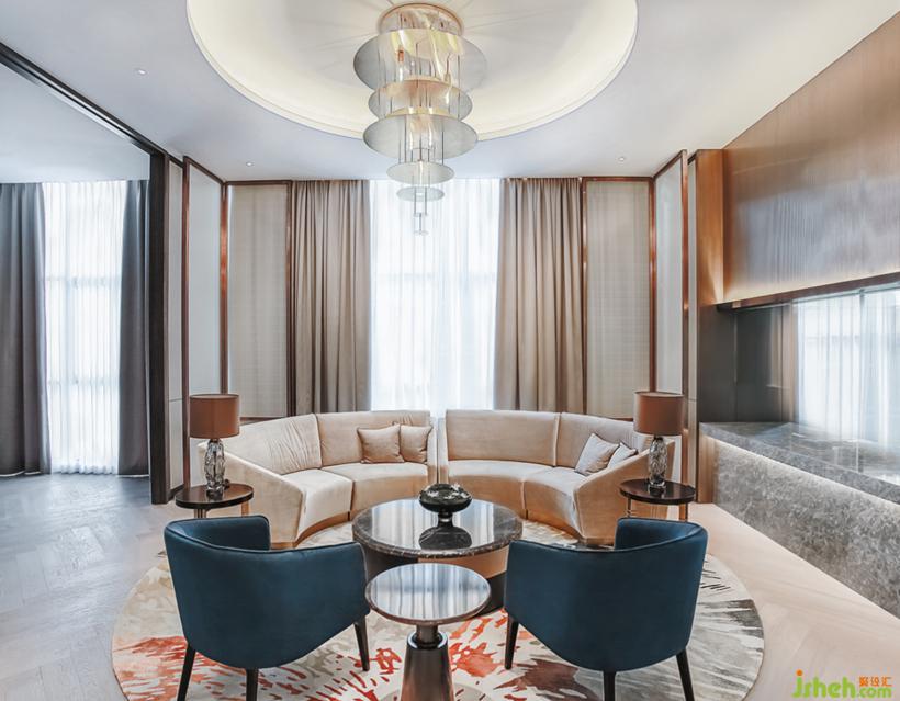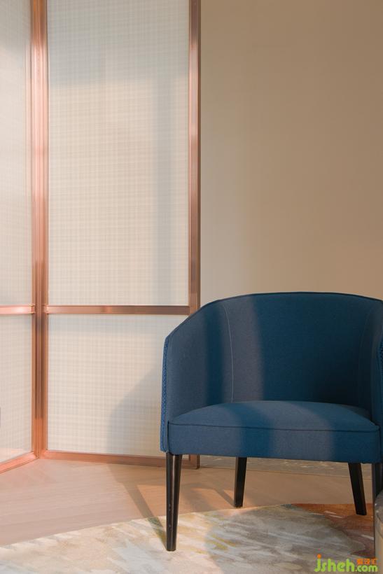簽約區(qū)以和諧作為主要表達(dá),向心式的布局手法促進(jìn)了人與人的交流,寶藍(lán)色單人沙發(fā)將整個空間由樸實(shí)帶向時尚與尊貴。
