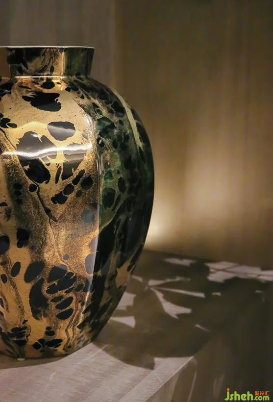 植物的倒影與花器斑駁的紋理形成了互動,精致的陳設(shè)在燈光的映襯下更顯品質(zhì)。