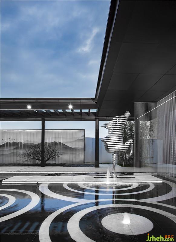 空間布局分為三個(gè)部分,分別是前院、中庭、以及后院,整個(gè)空間均以水墨江山之態(tài)貫穿著整個(gè)背景,如有浩然之氣、氣海山水蓄意待發(fā),遂尋白馬之軀來立其為本命之物,將此意此境匯于此景中,可謂是賦予其意了。前廳塑玄關(guān)庭院為場(chǎng)境背景,馬軀以鋼材層層羅列而成,引水柱漣漪之流為馬體之血脈,水體循環(huán)不斷,如隱如現(xiàn)、欲奔而躍,賦予其生生不息之態(tài)。