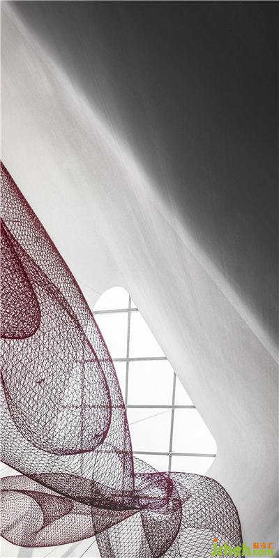 整個建筑分為三層,每層的外輪廓一致,以重心為圓心順時針旋轉(zhuǎn)8度,讓整個建筑呈現(xiàn)出動態(tài)美感,同時扭動、旋轉(zhuǎn)、規(guī)律的拉鎖扣件讓整個建筑呈現(xiàn)出一種律動的美感。內(nèi)部布置了一個“火山口”,使得建筑局部空間層高達(dá)到16.5米,增加空間給人的沖擊力。