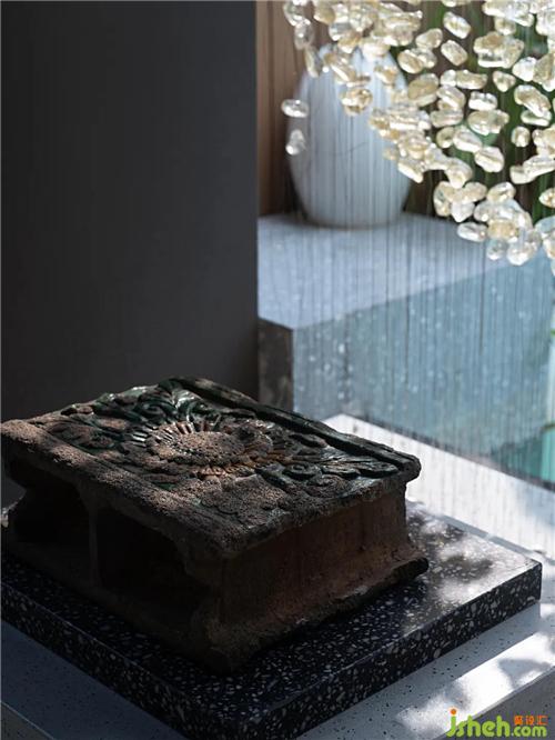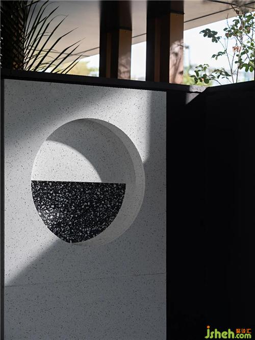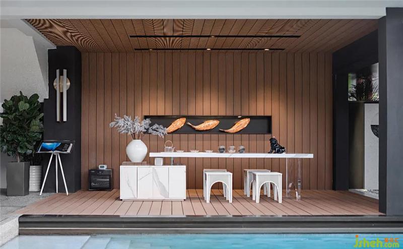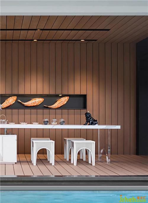 中國禮序講究幾進(jìn)幾出,我們不希望所有人就像進(jìn)菜園門一樣隨隨便便就進(jìn)來,而是要通過這樣的一個儀式感的狀態(tài),從側(cè)面來到我們主空間。我們還設(shè)計了一個很大的超尺度的這樣的一個泳池,不同于別墅型的泳池,我們把絕大多數(shù)空間留給泳池以及可以做派對、餐飲的地方。原本大的尺度減小了,小的尺度放大了,打造出別樣的生活方式。這是比較大的驚喜。