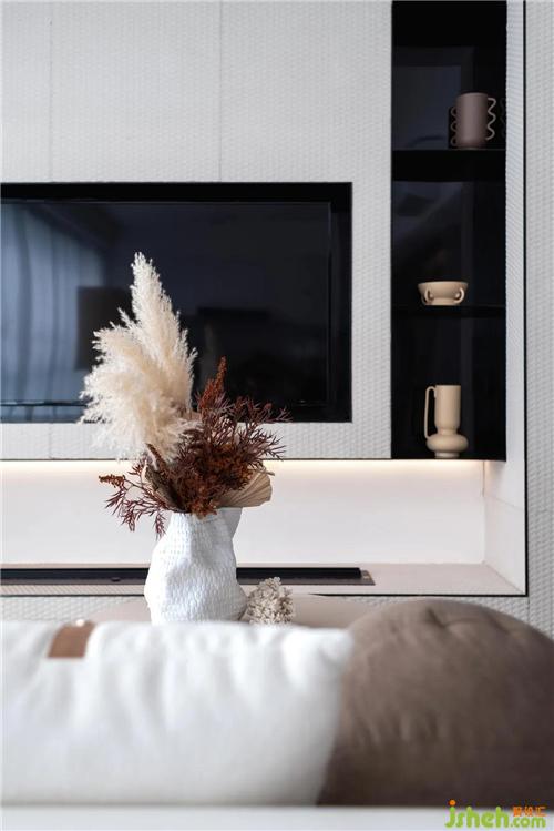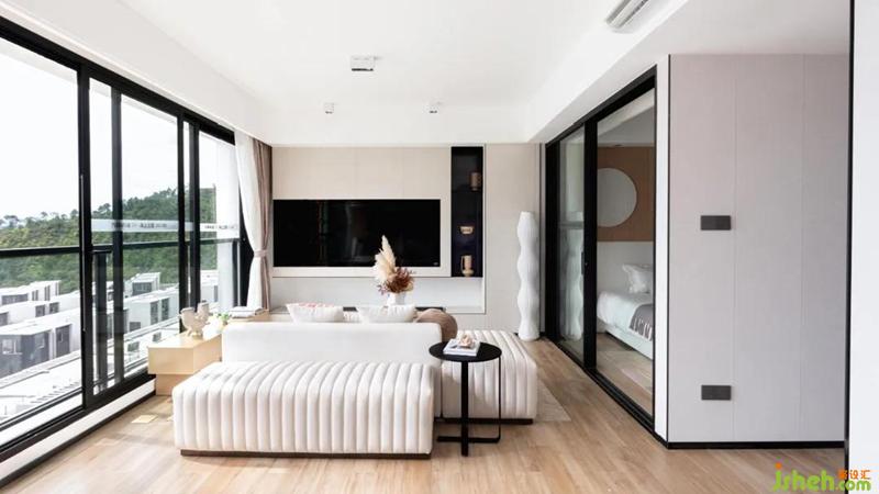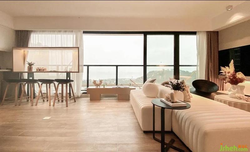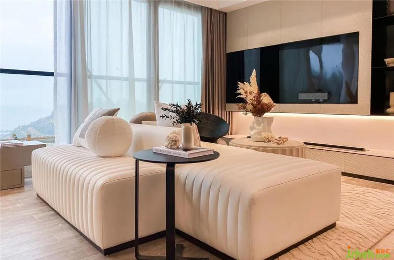 沙·嶼的空間人物定位是好友歡聚,一片海景填滿的8米大橫廳,為空間灑落大面積的光影,抬頭便可觀云卷云舒,遠(yuǎn)眺即獲蔚藍(lán)大海。