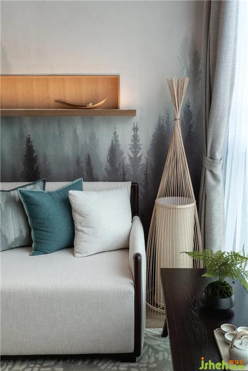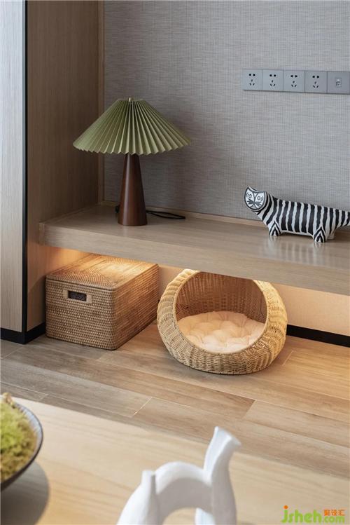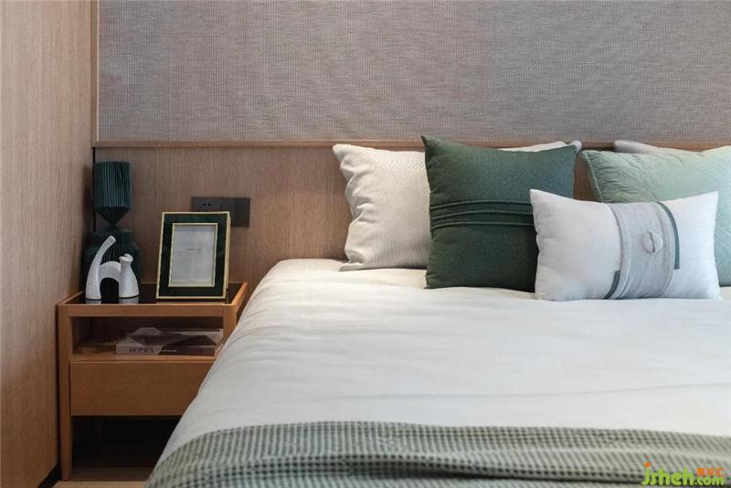 臥室的背景墻采用淡黃色的藤編織物,與清雅的綠色調(diào)床品形成對比,不論是色調(diào)還是織物都不約而同營造出了舒適慵懶的氛圍感。
