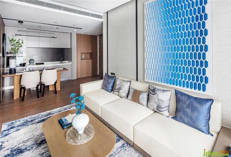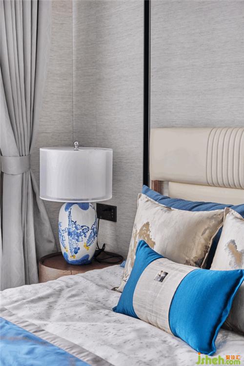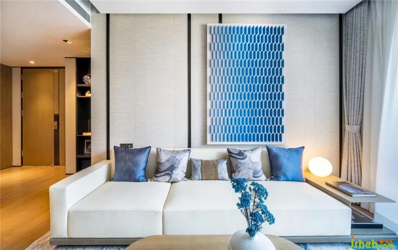 以民族特色的青花圖案表現(xiàn),讓整個(gè)空間傳統(tǒng)中透著現(xiàn)代,現(xiàn)代中揉著古典樣板房設(shè)計(jì)。客廳白色是整個(gè)房間的主體色,藍(lán)色鋪墊,營造出一派清秀雋永的青花留白之美。