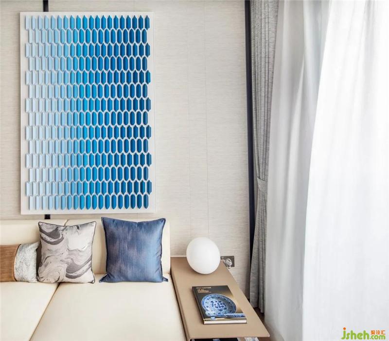 客廳堅(jiān)持以傳統(tǒng)印染工藝的同時(shí)吸納外界各種藝術(shù)形態(tài)帶來的靈感,將漸變的陶瓷片形成天空暈染的藝術(shù)品。在中國傳統(tǒng)色彩中提取詩意的花青色作為裝飾色,提取吉金色作為點(diǎn)綴, 并平衡空間中的色彩分布。