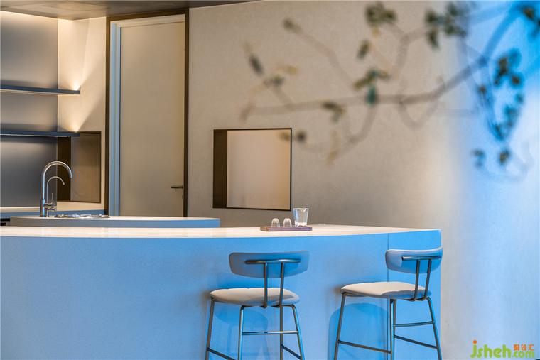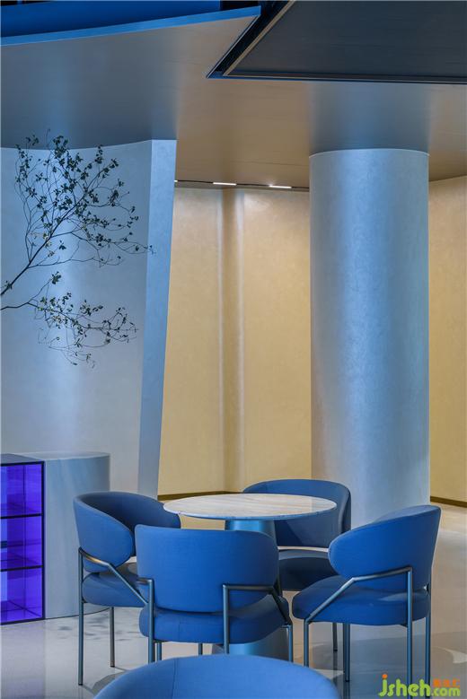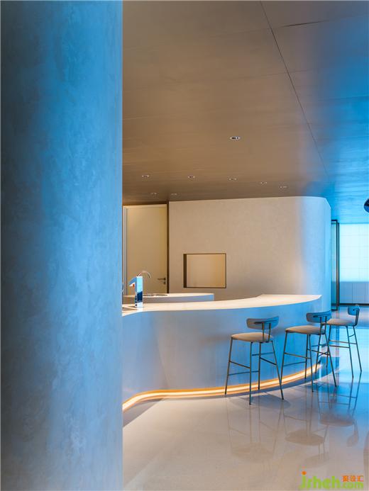 空間材料仍以簡(jiǎn)潔清晰為基調(diào),純白色曲面墻向內(nèi)彎曲,健康設(shè)計(jì)將視線引入反光的金屬色內(nèi)部,與藍(lán)色港灣園區(qū)粗糲的磚石地面構(gòu)成令人眼前一亮的反差。