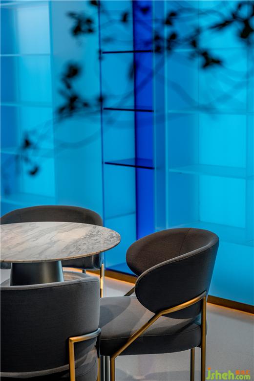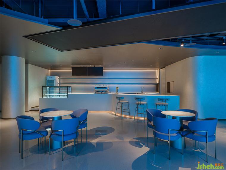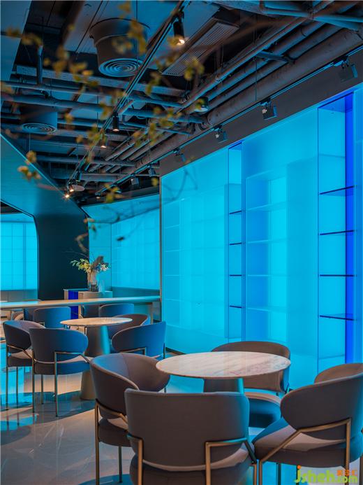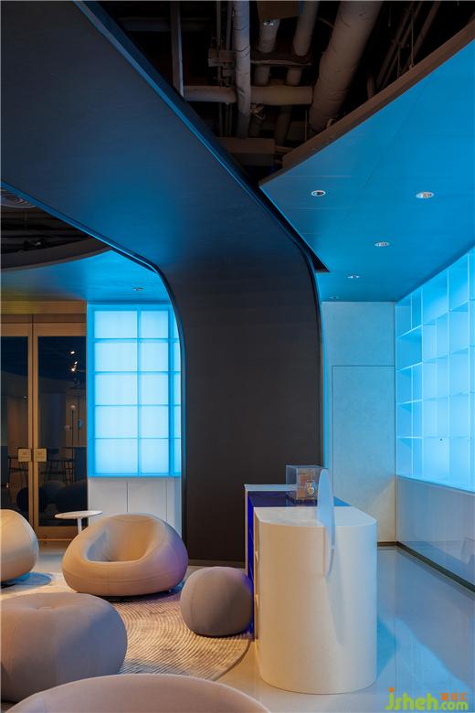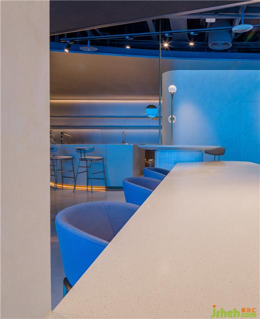 進(jìn)入內(nèi)部,富于動(dòng)感的流線結(jié)構(gòu)自天花蔓延至垂直空間,色彩與材質(zhì)將層次拉開(kāi)并在主落座區(qū)延展視線。藍(lán)色燈光將整個(gè)空間拉入海洋場(chǎng)景——黑色裸裝屋面帶來(lái)酷感,又渲染出海洋與科技的深邃艱深;巨型帶狀LED屏在頂部和立面環(huán)繞流動(dòng);健康設(shè)計(jì)透光展架夢(mèng)幻迷蒙,向無(wú)限深遠(yuǎn)處彌漫;展臺(tái)、座椅是凝固的巖石,白色泡沫與藍(lán)色海水沖刷內(nèi)部,激蕩出一個(gè)變幻莫測(cè)、寧?kù)o與活力共存的多元空間。