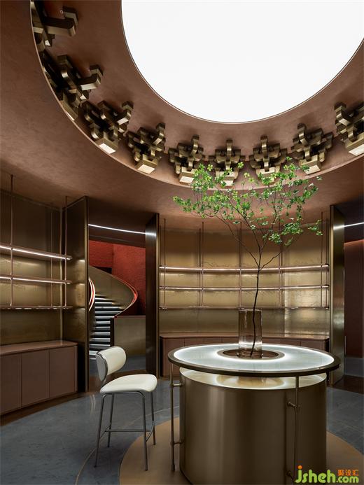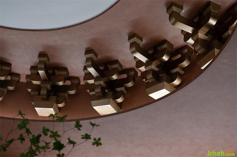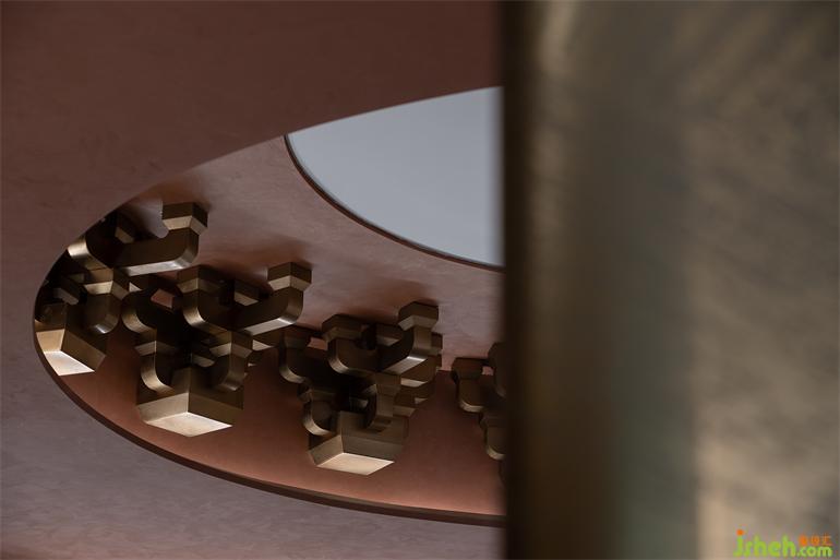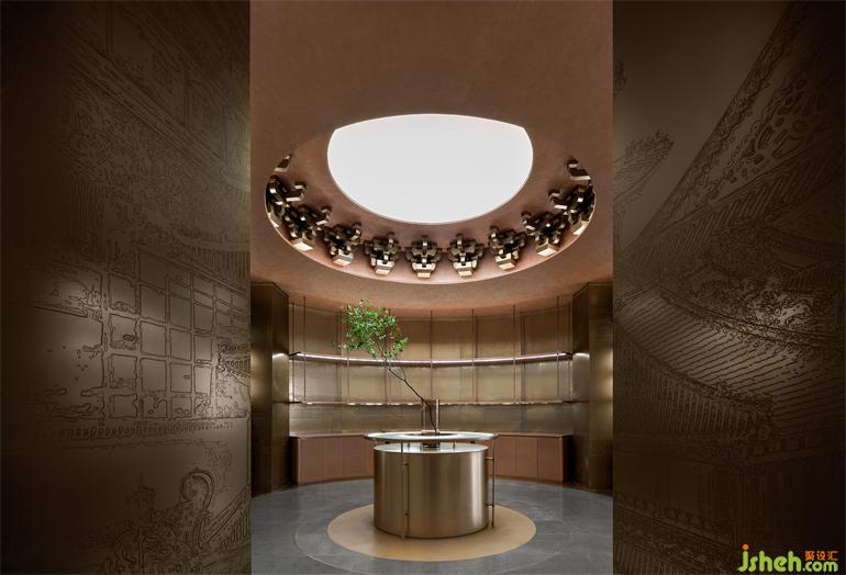 中央黃銅圓形主體裝置隱喻二層“藏禮于器”的空間哲學。斗拱解構后在頭頂呈現(xiàn)出強有力的結構形式,在高處豐富了空間和意象上的細節(jié),與黃銅上的蝕刻畫形成立體與平面的補全,由古而今,藝術表現(xiàn)的漫長演繹中,我們的精神堡壘愈發(fā)清晰堅固。
