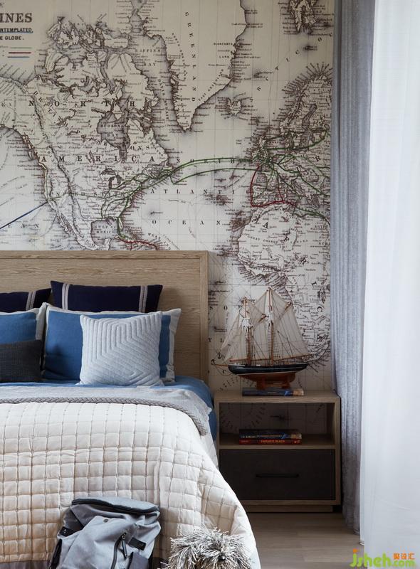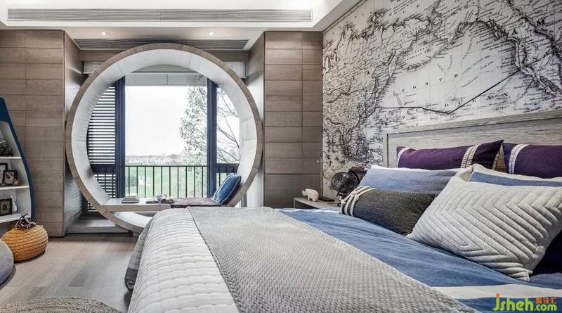 二樓長廊左右設有長輩房和兒童房,明亮的玻璃窗與餐廳視線交互,帶來與客廳家人互動的樂趣。臥室采用溫和的材質,散發(fā)寧靜的氣息。男孩房的飄窗區(qū)域增加收納功能,圓形的造型與世界地圖相輔相成,像望遠鏡的形狀,遠眺窗外蔥蘢的世界。