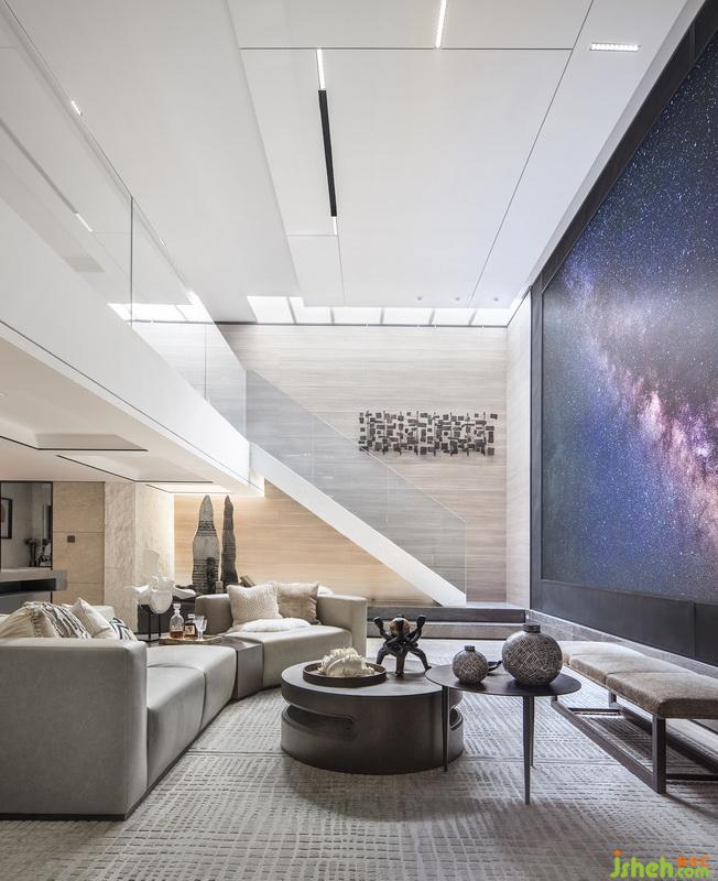 負層作為重要的娛樂休閑空間,電影廳、品酒區(qū)、棋牌室一應俱全,滿足慢節(jié)奏的生活模式。立體式的設計,讓各個功能區(qū)域在此和諧一體。借天窗自然采光,負層空間絲毫沒有陰沉之氣,令人更為愉悅。