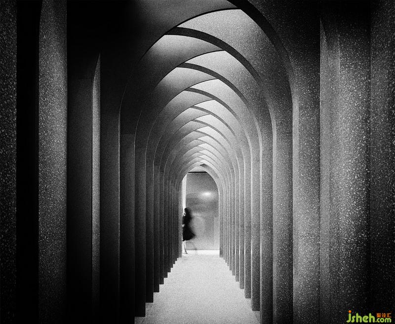 墻面和拱頂交界使用燈具呼應(yīng)半圓,嚴(yán)絲合縫的線條切割與裝飾工藝使空間向兩側(cè)延伸,舒適的桌椅隨之?dāng)[放排列,給空間增添一分幽靜慵懶之感。
