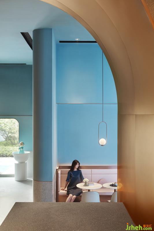 弧線仍然在點題:水吧區(qū)的轉(zhuǎn)角、天花的邊緣,甚至到就餐區(qū)的動線都是一個優(yōu)雅的弧線。就餐區(qū)以寶藍(lán)色為主色調(diào),寶藍(lán)色代表著時尚、健康、年輕化,非常契合項目所提倡的餐飲新風(fēng)尚。