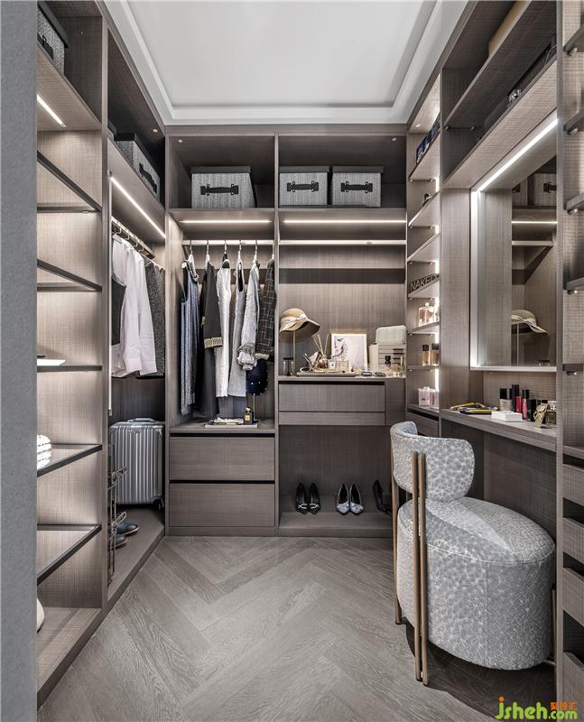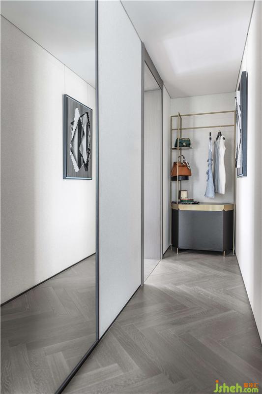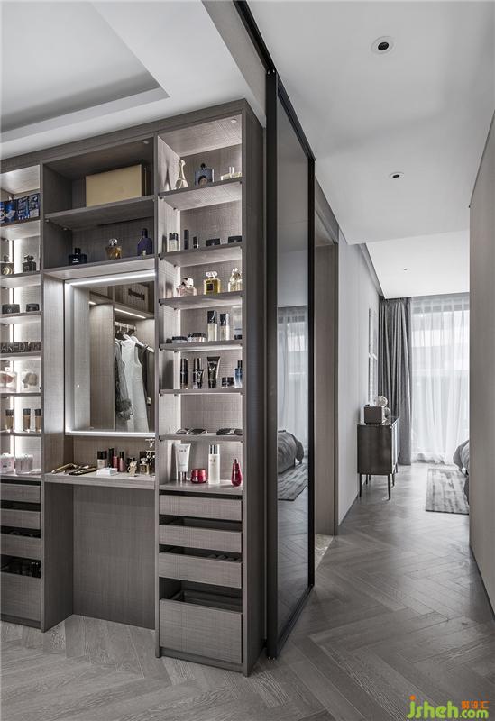 設(shè)計師為主臥設(shè)計主衛(wèi)-步入式衣帽間-全身鏡這條流線,集中流暢地滿足男女主人日常儀容打扮的需求。