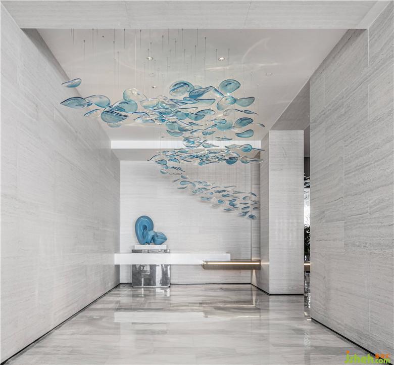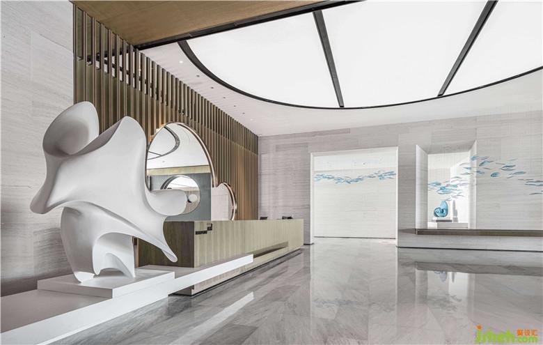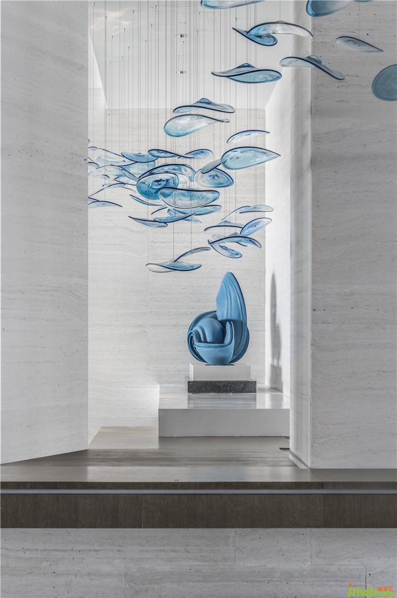 為了創(chuàng)造更流暢舒適的空間體驗,設(shè)計師特意設(shè)計了兩條動線,在接待前廳中預(yù)留了兩個方位的門洞,促使首次/二次造訪的人群盡量不互相干擾。任意選擇一條路徑探索,都有曼妙的藝術(shù)相隨。其中右側(cè)是如海水般流動的軟裝琉璃裝置,這正是日出東方照射著海平面時波光粼粼的情景。