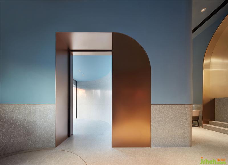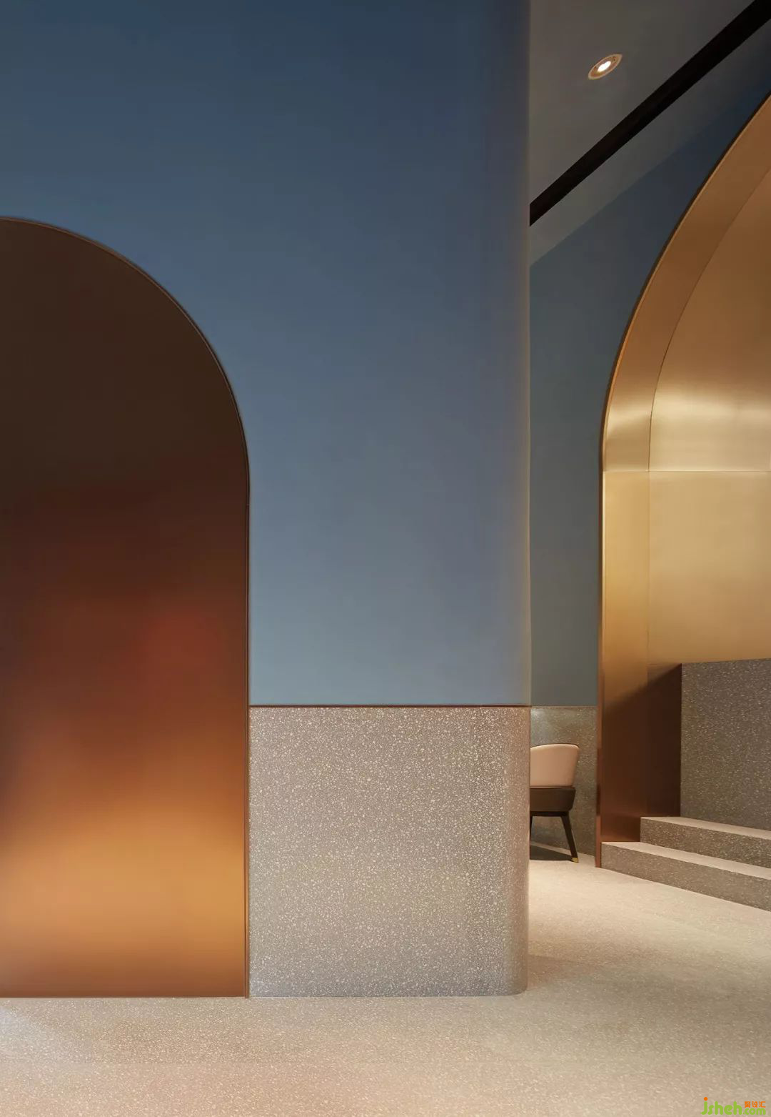 墻面和拱頂交界使用燈具呼應(yīng)半圓,嚴(yán)絲合縫的線條切割與裝飾工藝使空間向兩側(cè)延伸,舒適的桌椅隨之?dāng)[放排列,給空間增添一分幽靜慵懶之感。