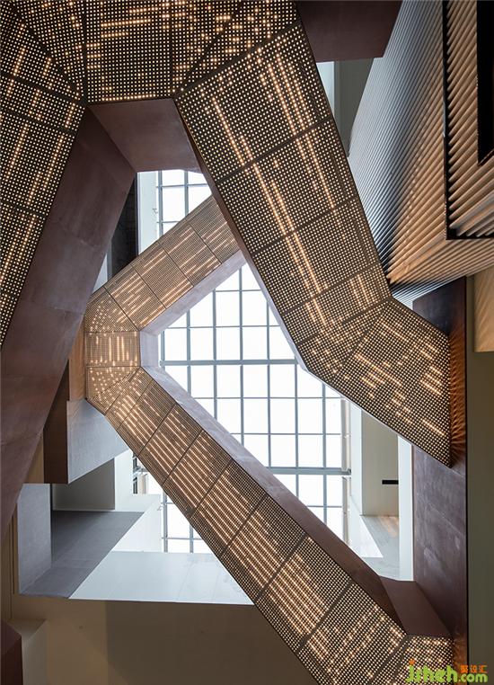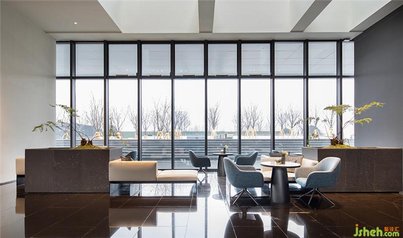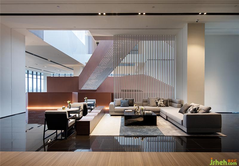步入首層大堂,接待處黑鋼背景墻開(kāi)啟了一段未知的空間之旅,有序陣列的穿孔燈光,指引著前進(jìn)的方向。光線從落地窗傾灑至整個(gè)空間,觀者進(jìn)入前廳一瞬間就感受建筑的氣魄,仿佛置身藝術(shù)長(zhǎng)廊