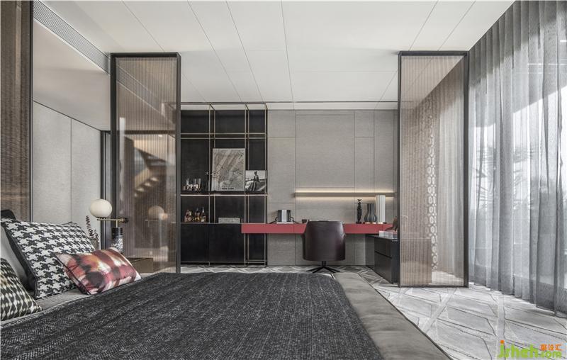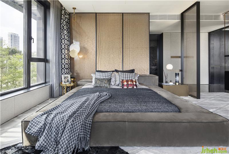 寬敞的主臥擁有橫跨兩個(gè)開(kāi)間的尺度?,F(xiàn)代化大都會(huì)風(fēng)格之下,空間多采用筆直銳利的線條,呈現(xiàn)出一種簡(jiǎn)潔又不落俗套的干練氣質(zhì)。