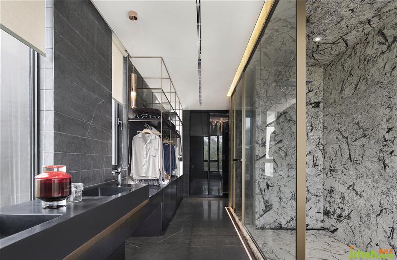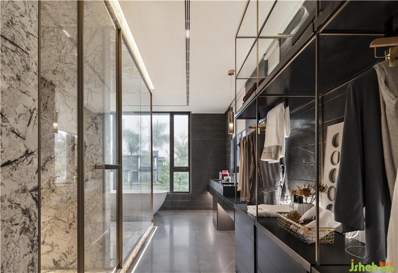 主衛(wèi)中,設(shè)計(jì)打破陳規(guī),將淋浴間與衛(wèi)生間置于整個(gè)主衛(wèi)的中央,覆以大理石作背景墻,又加黃銅金屬位塑造框架,創(chuàng)造出趣味性與時(shí)尚性兼具回環(huán)動(dòng)線和視覺(jué)焦點(diǎn)。圍繞“中島”結(jié)構(gòu),再整合步入式衣帽間、洗漱臺(tái)和浴缸區(qū),令整個(gè)主衛(wèi)突破固有的形制,煥發(fā)出全新的空間氣質(zhì)。