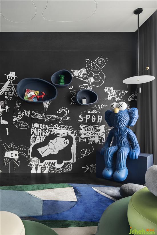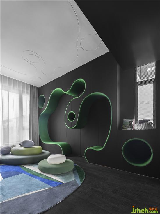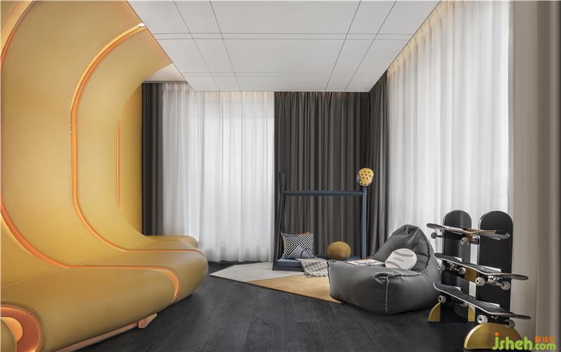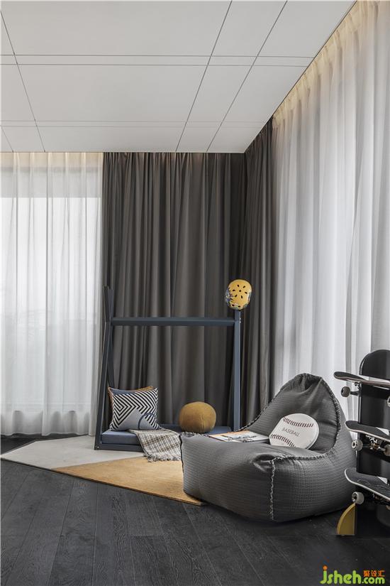兒童房在類似的“黑曜石”質(zhì)感基礎(chǔ)上,以黃、綠詮釋寧?kù)o、動(dòng)感的氛圍,貼合兩個(gè)孩子截然不同的性格。
