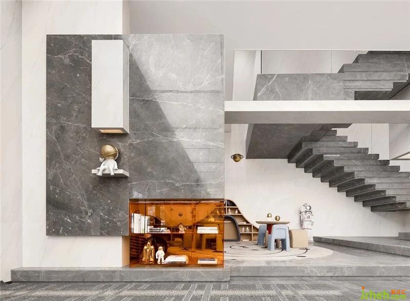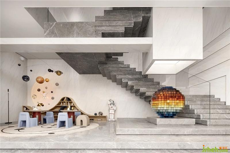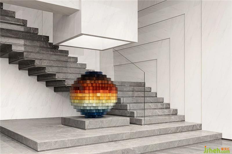通往二層樓梯采用沉穩(wěn)的灰色大理石紋路設(shè)計(jì),與墻飾形成空間上的呼應(yīng),灰白色系由淺至深,引人入勝。在此襯托下,由太陽(yáng)系八大行星概念組成的裝飾球體,為低飽和度的空間注入一抹鮮色,成為點(diǎn)睛之筆廣州售樓處設(shè)計(jì)。